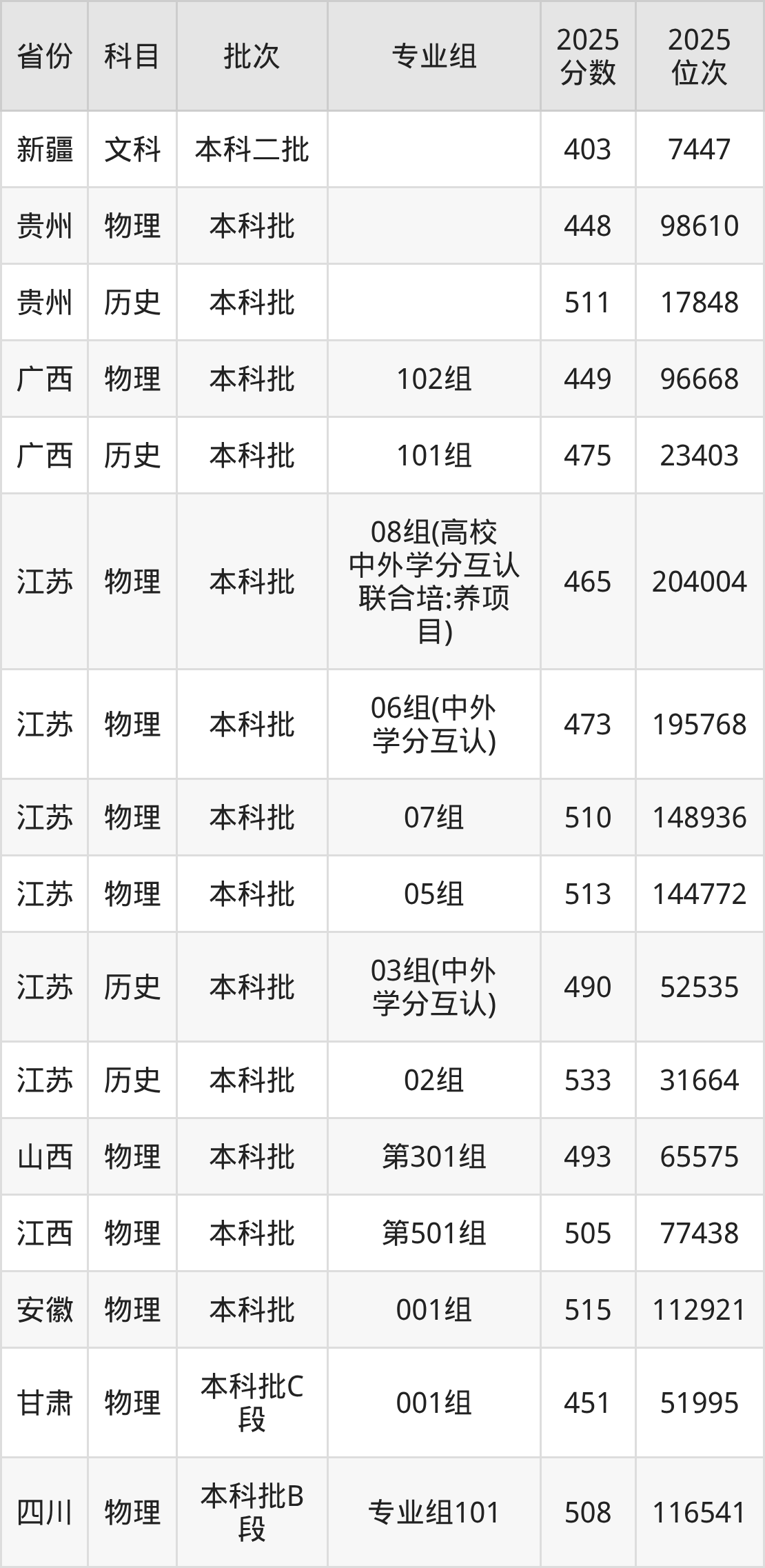 泰州学院08组(高校中外学分互认联合培:养项目):2025年投档录取最低分为465分,录取最低位次为204004名。