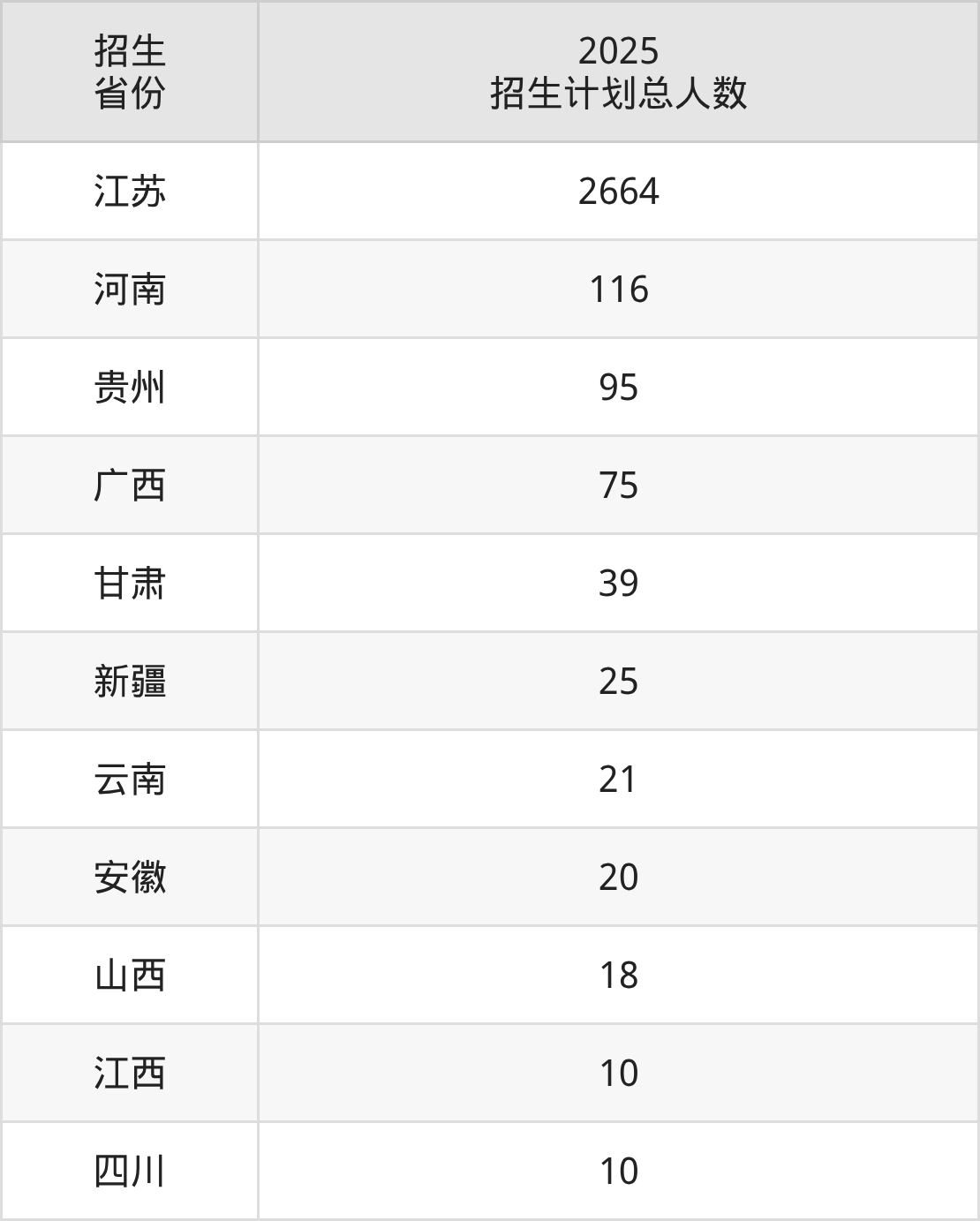 2025年泰州学院面向全国11个省市开展本科招生;招生专业共27个,招生人数共3093人。2025年在江苏省招生计划总人数是2664人,其中,泰州学院在江苏省招生人数最多的是计算机科学与技术。泰州学院在各省具体招生人数情况如下表。