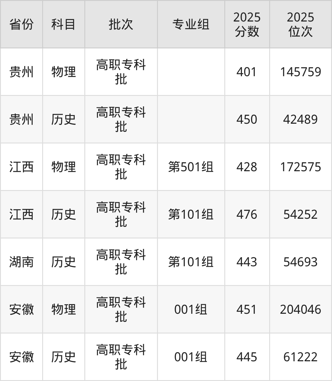 2025年在专科历史类进行招生,各专业组分数线详情如下: