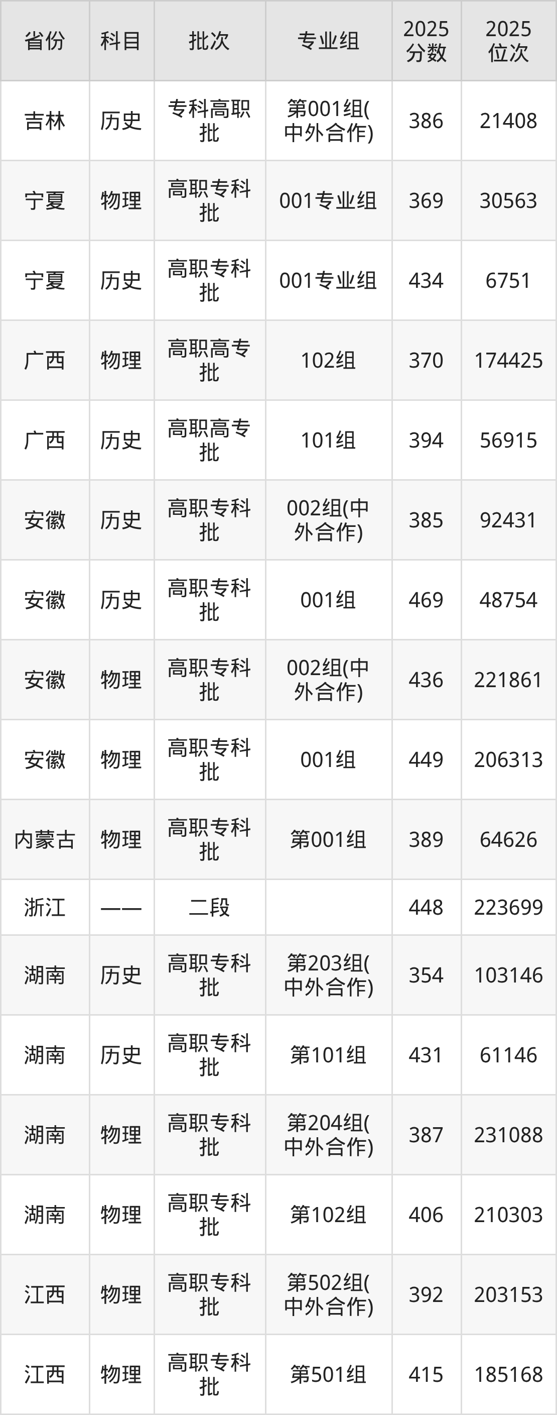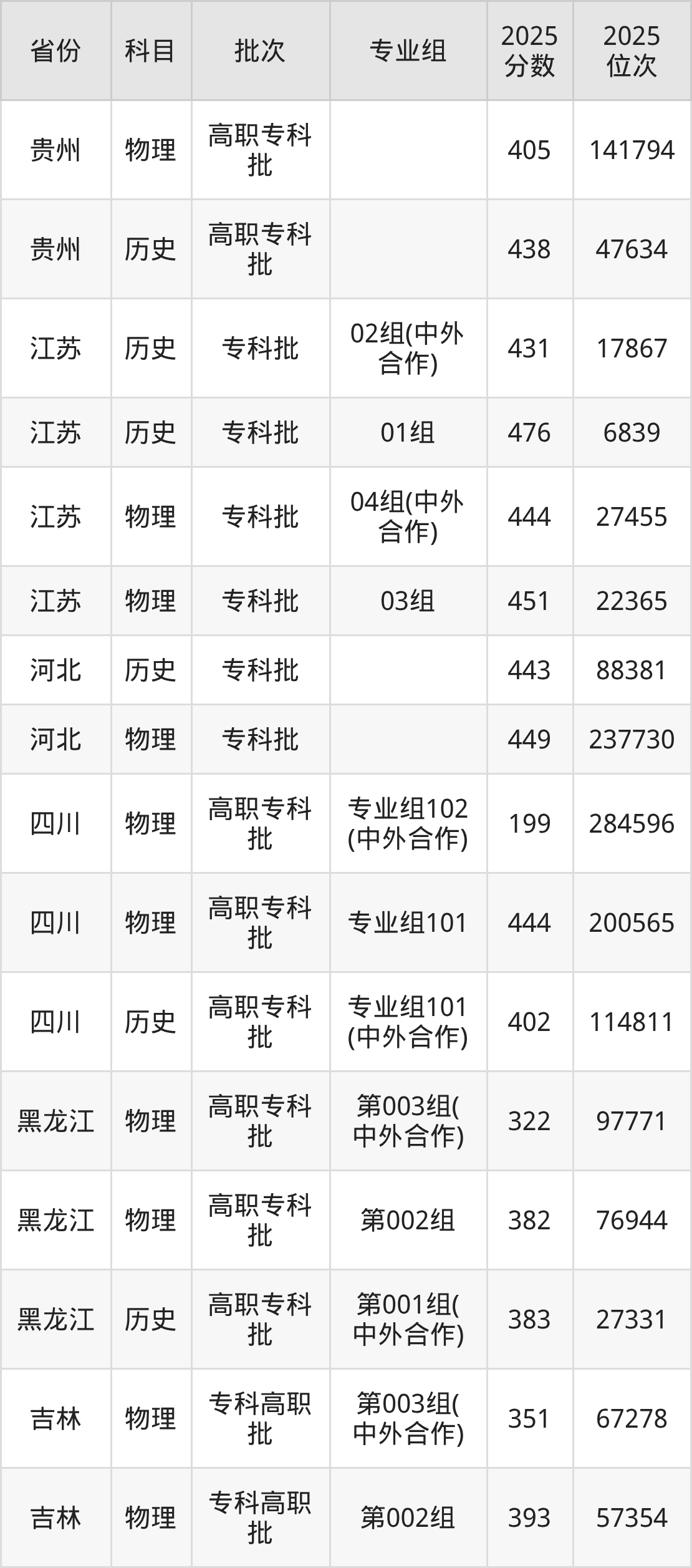 2025年在专科物理类进行招生,各专业组分数线详情如下: