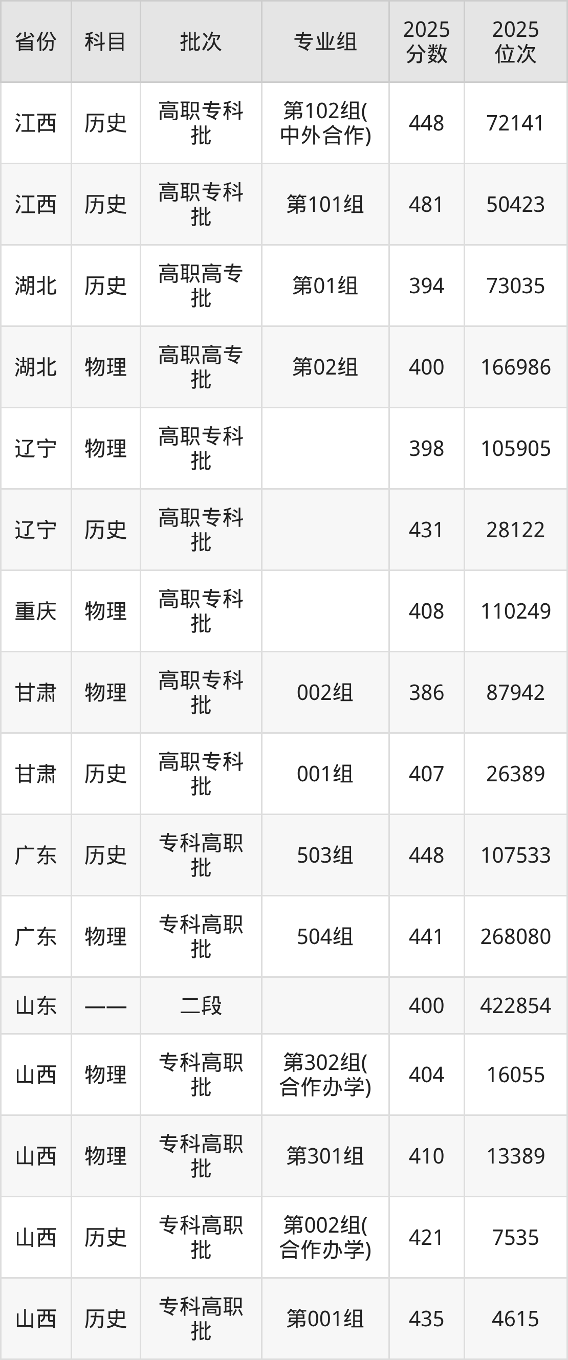 下面是2025年山东职业学院全国录取分数线一览表,请查阅。