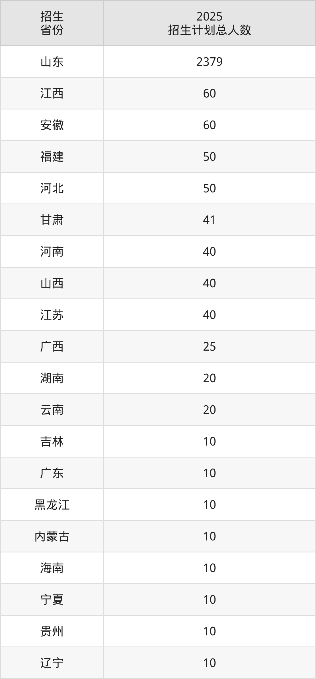 2025年山东职业学院面向全国25个省市开展专科招生;招生专业共37个,招生人数共2929人。2025年在山东省招生计划总人数是2379人,其中,山东职业学院在山东省招生人数最多的是铁道工程技术。山东职业学院在各省具体招生人数情况如下表。