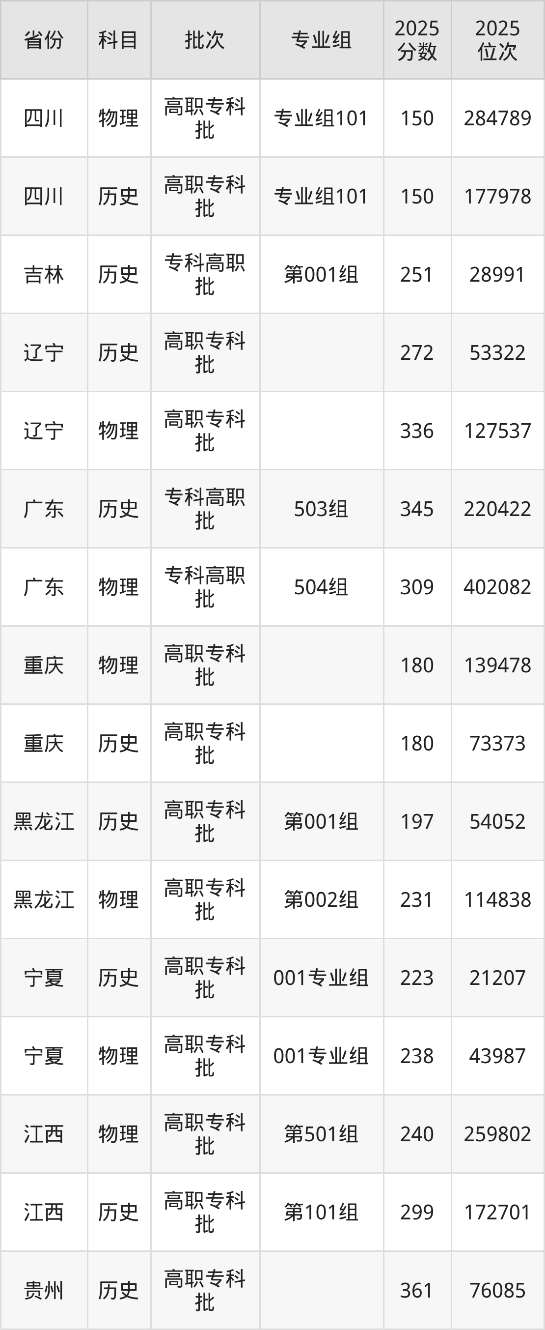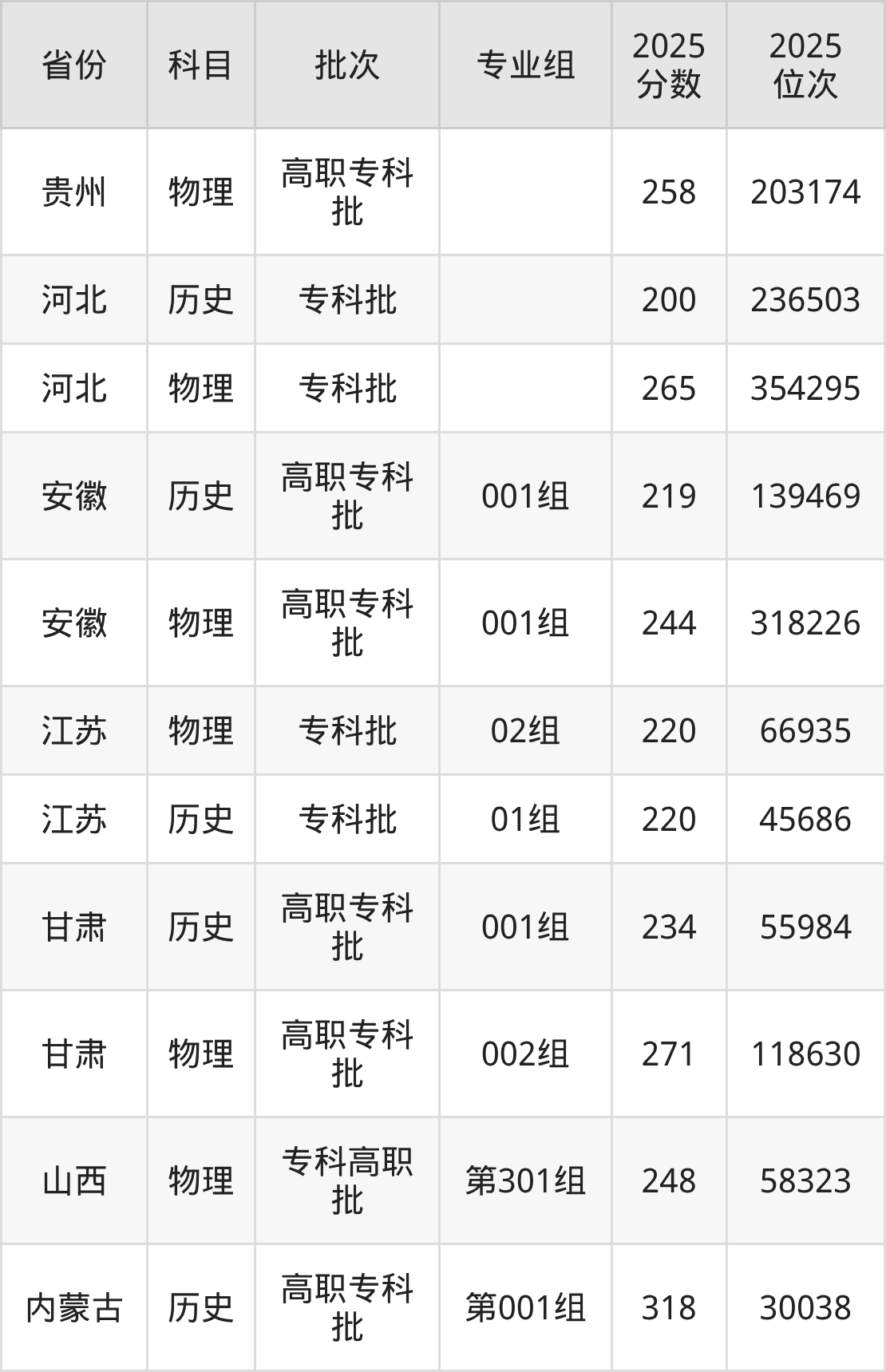 普通类专科物理类最低258分,专科历史类最低361分