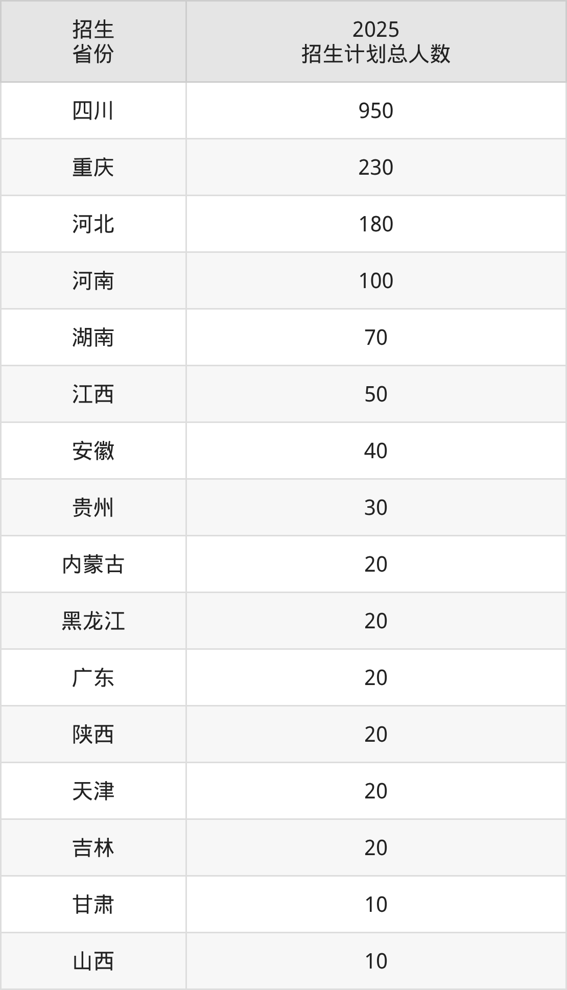 2025年眉山药科职业学院面向全国21个省市开展专科招生;招生专业共28个,招生人数共1840人。2025年在四川省招生计划总人数是950人,其中,眉山药科职业学院在四川省招生人数最多的是护理。眉山药科职业学院在各省具体招生人数情况如下表。