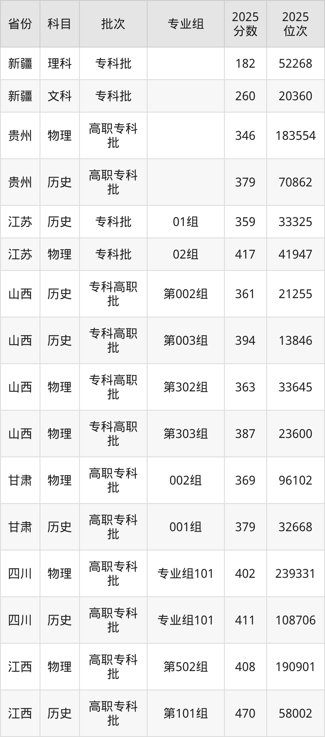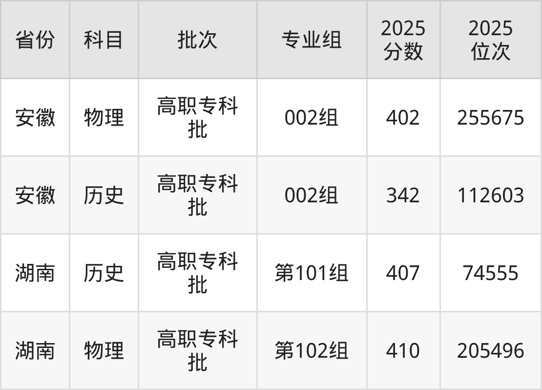 普通类专科历史类最低342分,专科物理类最低402分