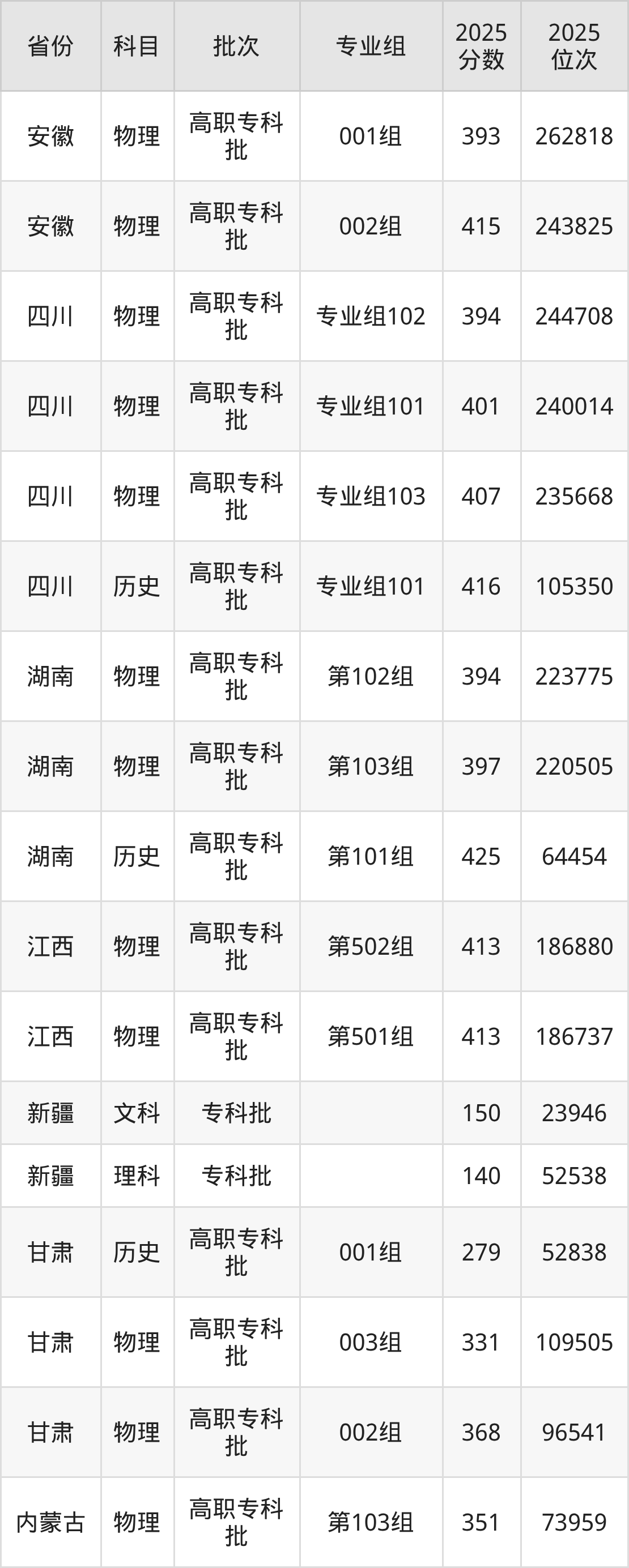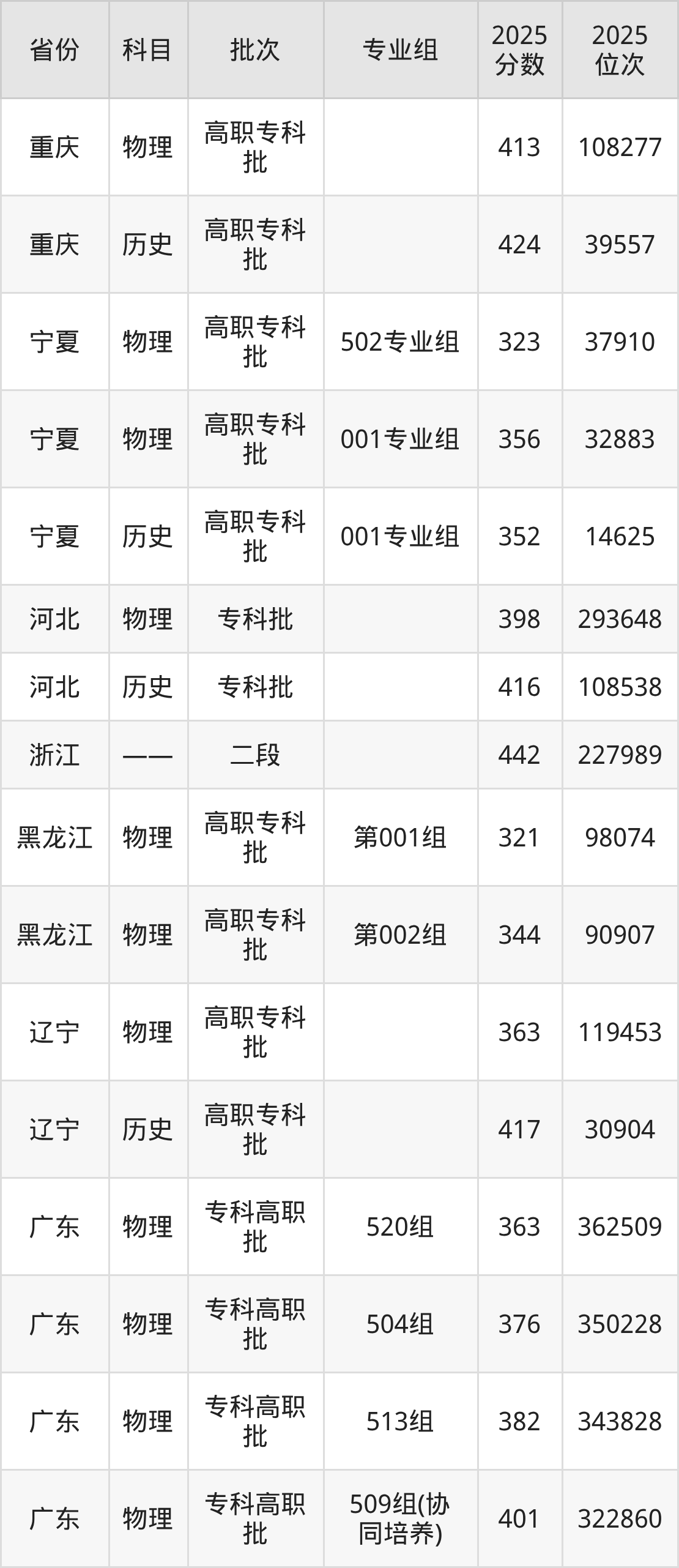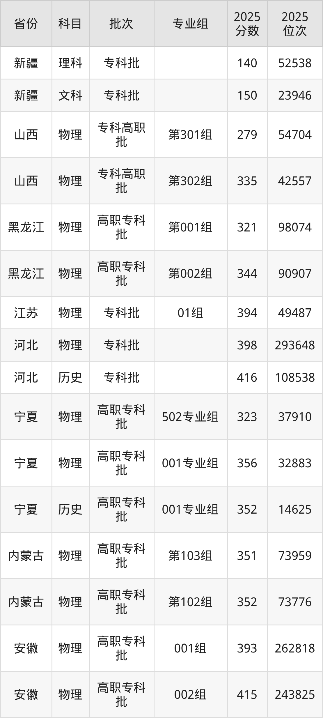 2025年在专科物理类进行招生,各专业组分数线详情如下:
