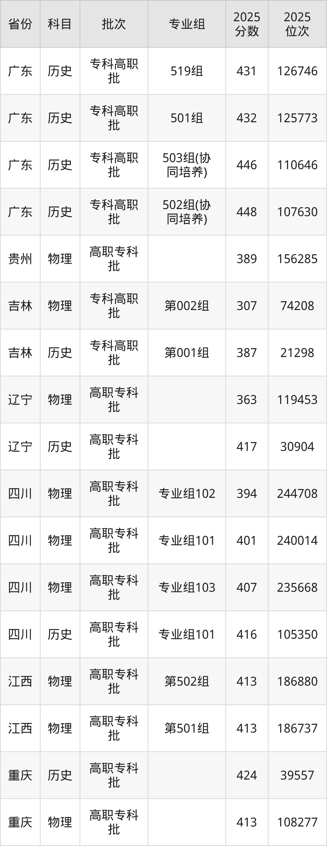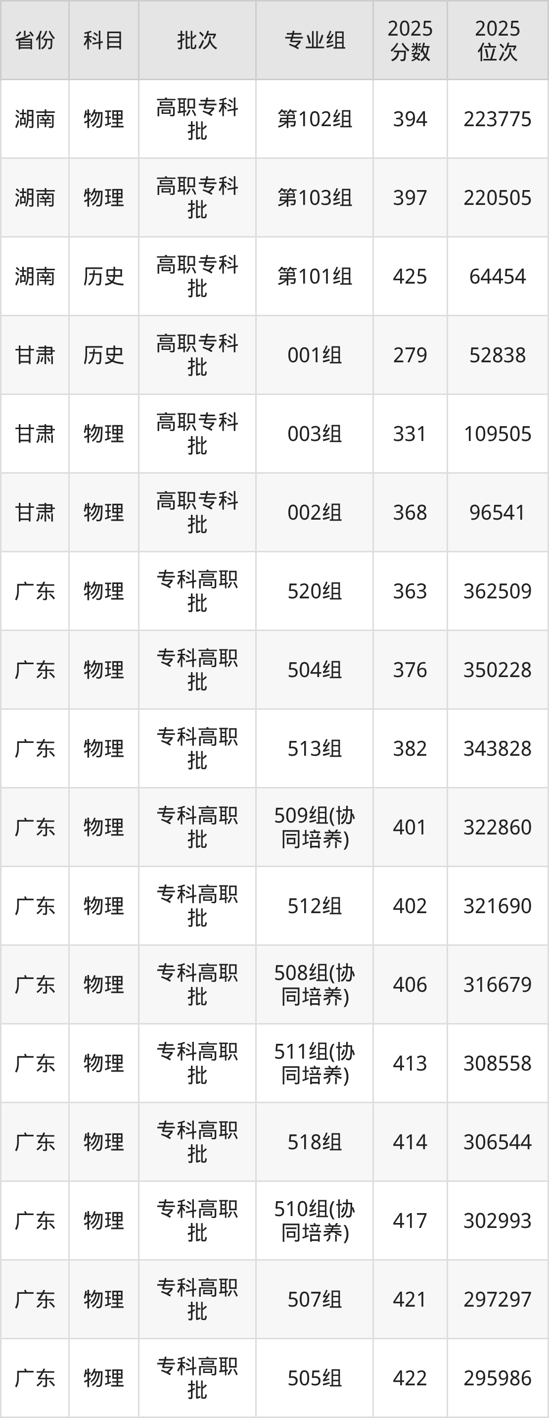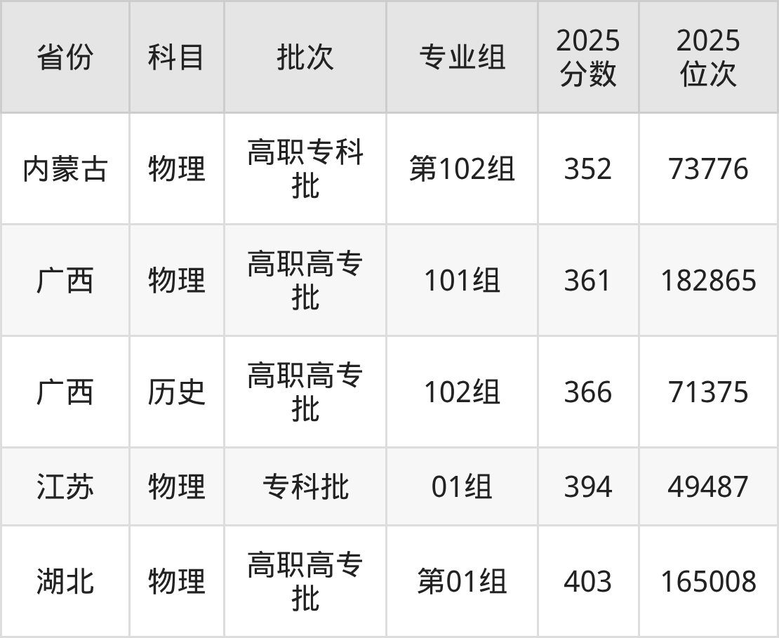 2025年在专科物理类进行招生,各专业组分数线详情如下: