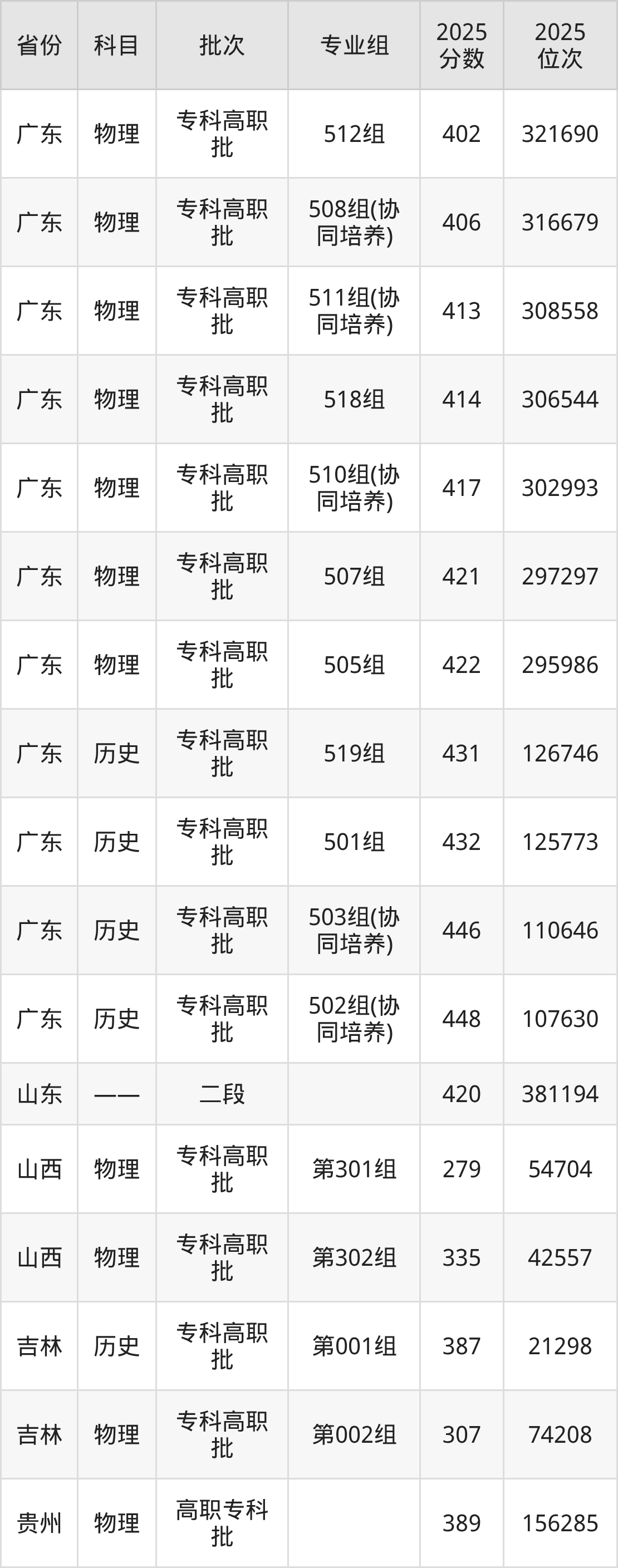 广州科技贸易职业学院509组(协同培养):2025年投档录取最低分为401分,录取最低位次为322860名。