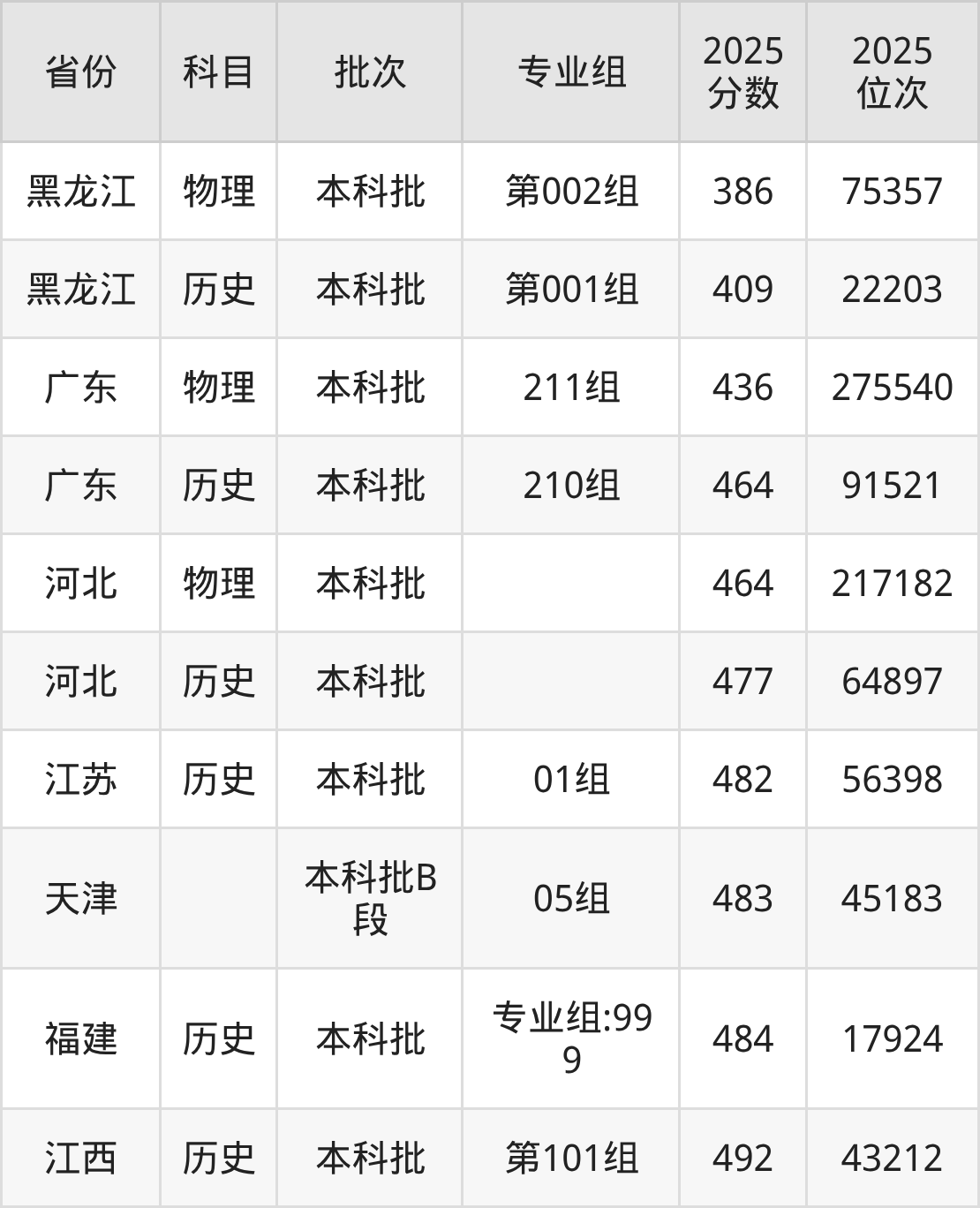 2025年在本科历史类进行招生,各专业组分数线详情如下: