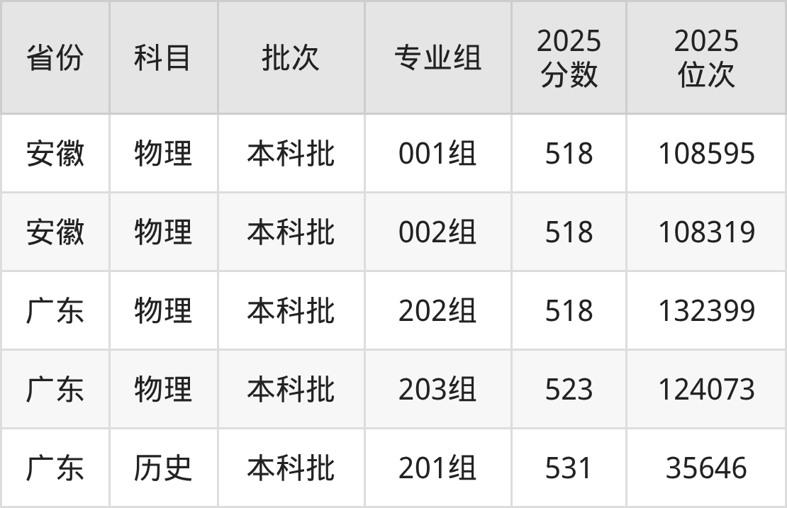 2025年在本科物理类进行招生,各专业组分数线详情如下: