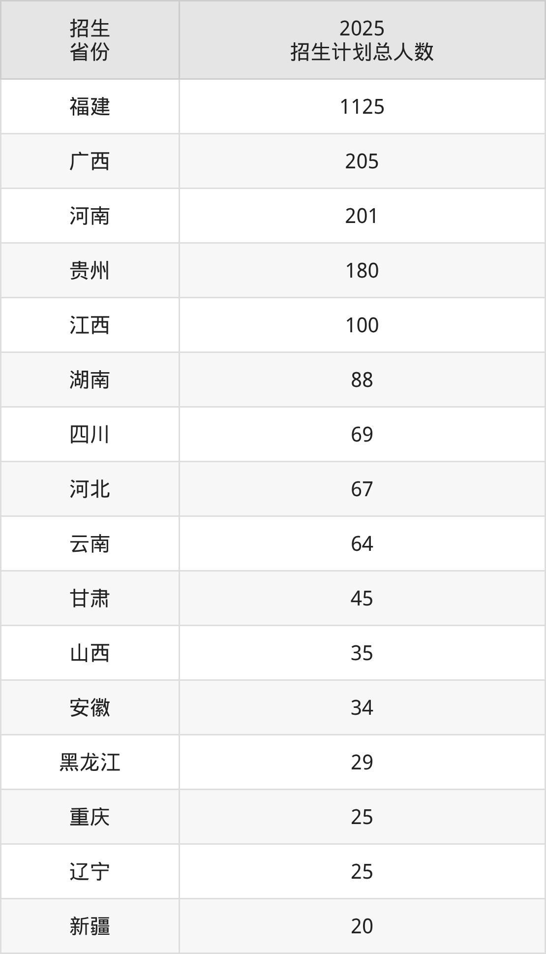 2025年三明学院面向全国24个省市开展本科招生;招生专业共36个,招生人数共2433人。2025年在福建省招生计划总人数是1125人,其中,三明学院在福建省招生人数最多的是人工智能。三明学院在各省具体招生人数情况如下表。