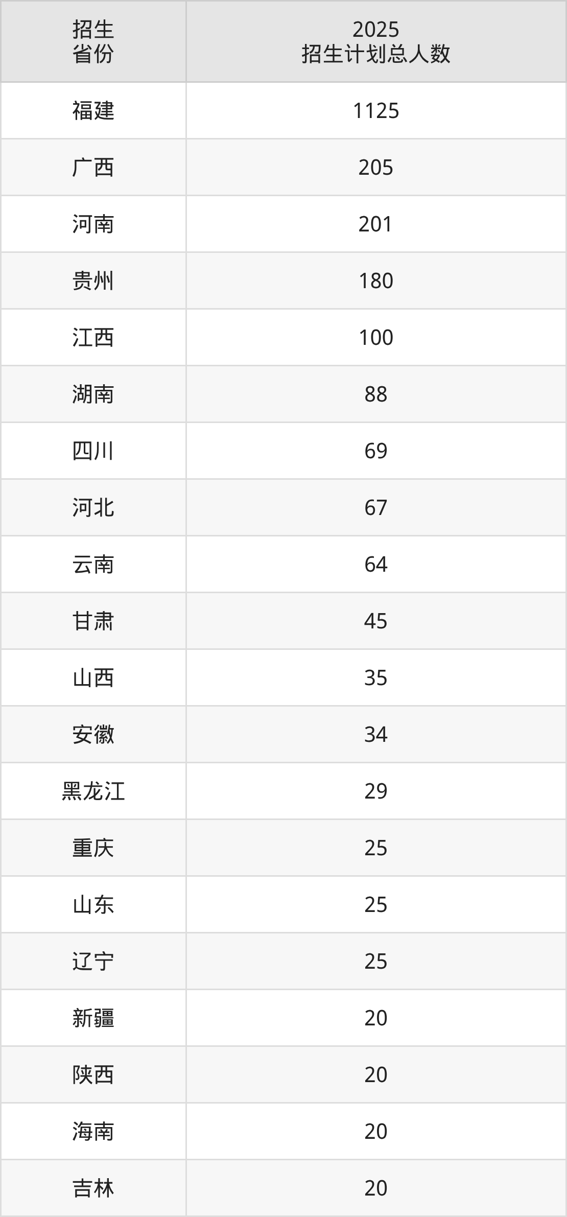 2025年三明学院面向全国25个省市开展本科招生;招生专业共36个,招生人数共2458人。2025年在福建省招生计划总人数是1125人,其中,三明学院在福建省招生人数最多的是人工智能。三明学院在各省具体招生人数情况如下表。