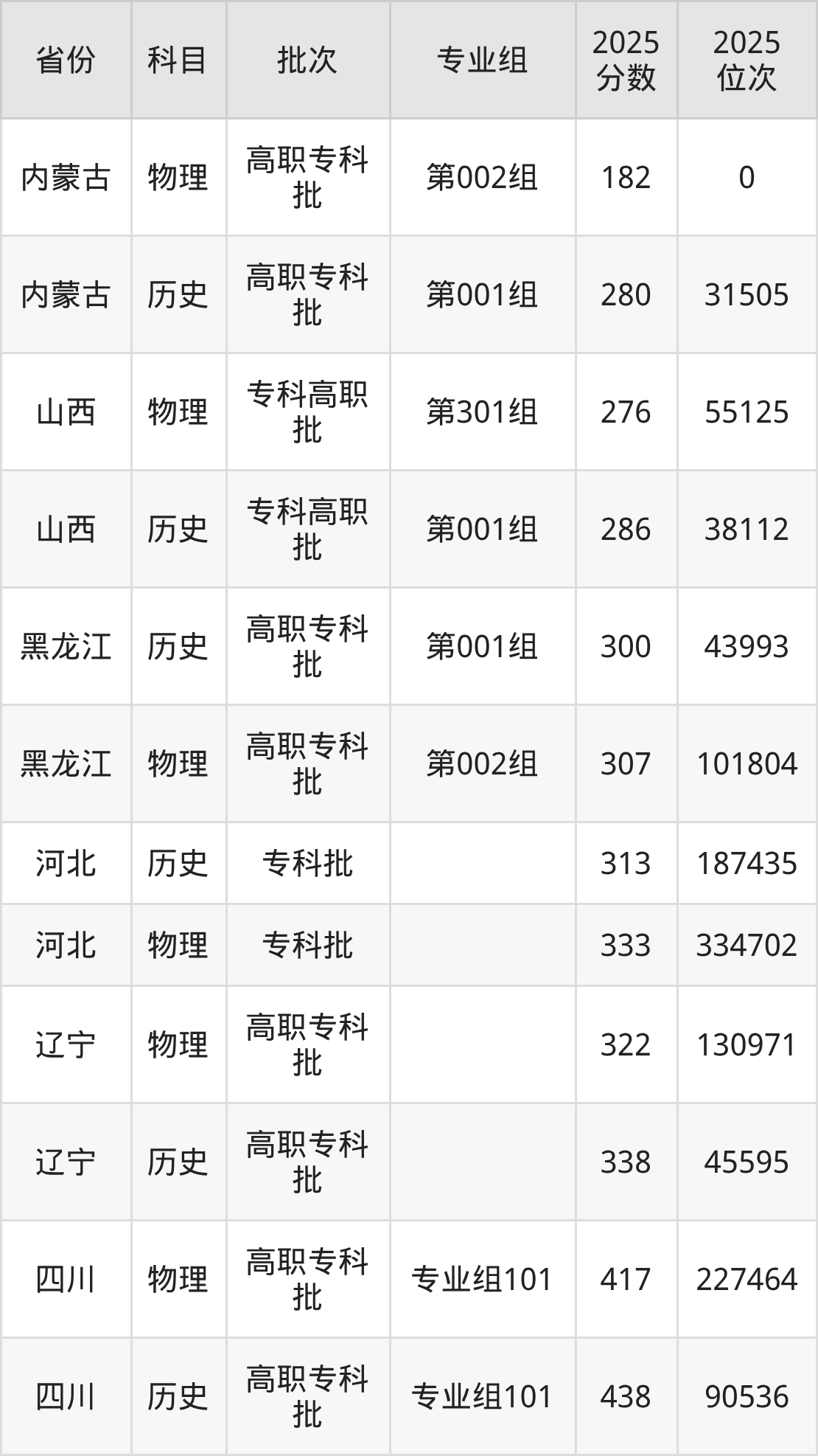 2025年北京经贸职业学院全国录取分数线是182分到438分,录取最低在内蒙古物理类(第002组)、录取最高在四川历史类(专业组101)。各省各专业组最低分具有差异,详情如下:
