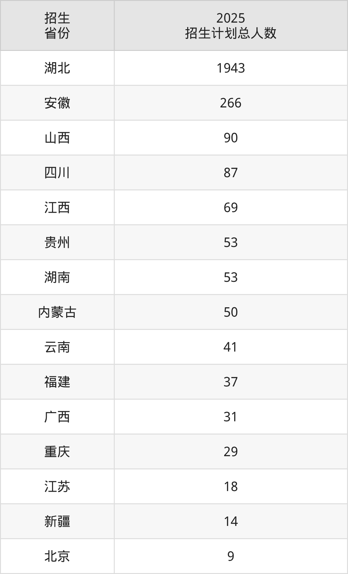 2025年武汉职业技术大学面向全国15个省市开展本科招生;招生专业共6个,招生人数共495人。2025年在湖北省招生计划总人数是1943人,其中,武汉职业技术大学在湖北省招生人数最多的是空中乘务。武汉职业技术大学在各省具体招生人数情况如下表。