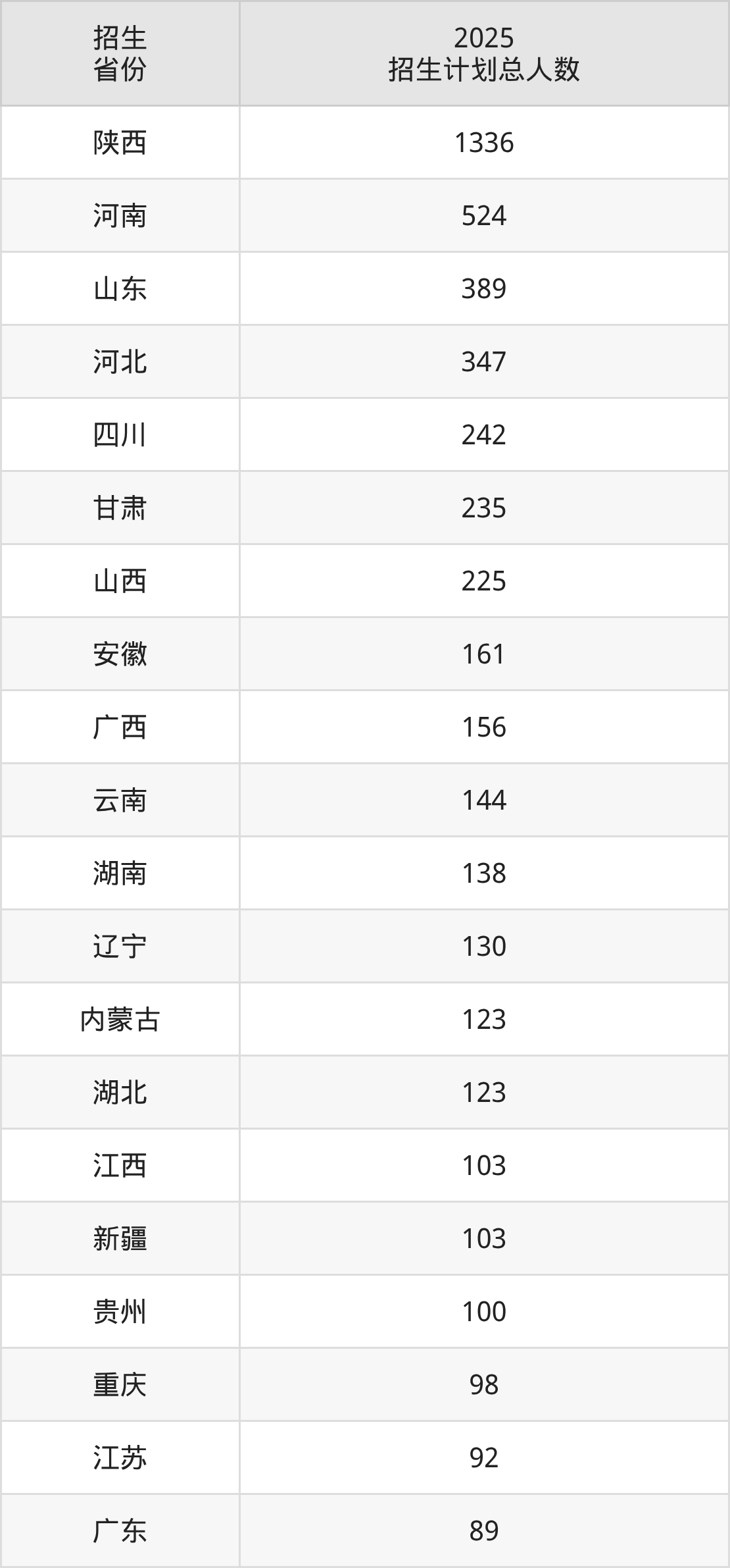 2025年西北农林科技大学面向全国29个省市开展本科招生;招生专业共62个,招生人数共5334人。2025年在陕西省招生计划总人数是1336人,其中,西北农林科技大学在陕西省招生人数最多的是计算机类。西北农林科技大学在各省具体招生人数情况如下表。