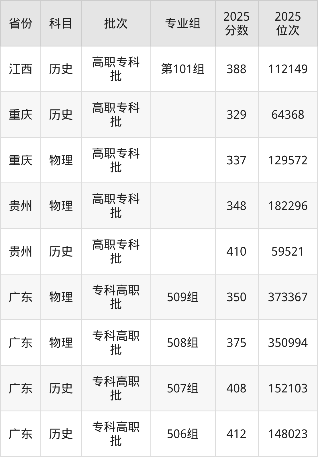 赣州职业技术学院专业组101:2025年投档录取最低分为377分,录取最低位次为254358名。