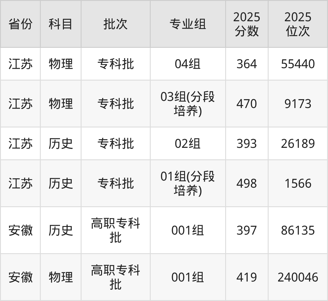 江阴职业技术学院03组(分段培养项目):2025年投档录取最低分为470分,录取最低位次为9173名。