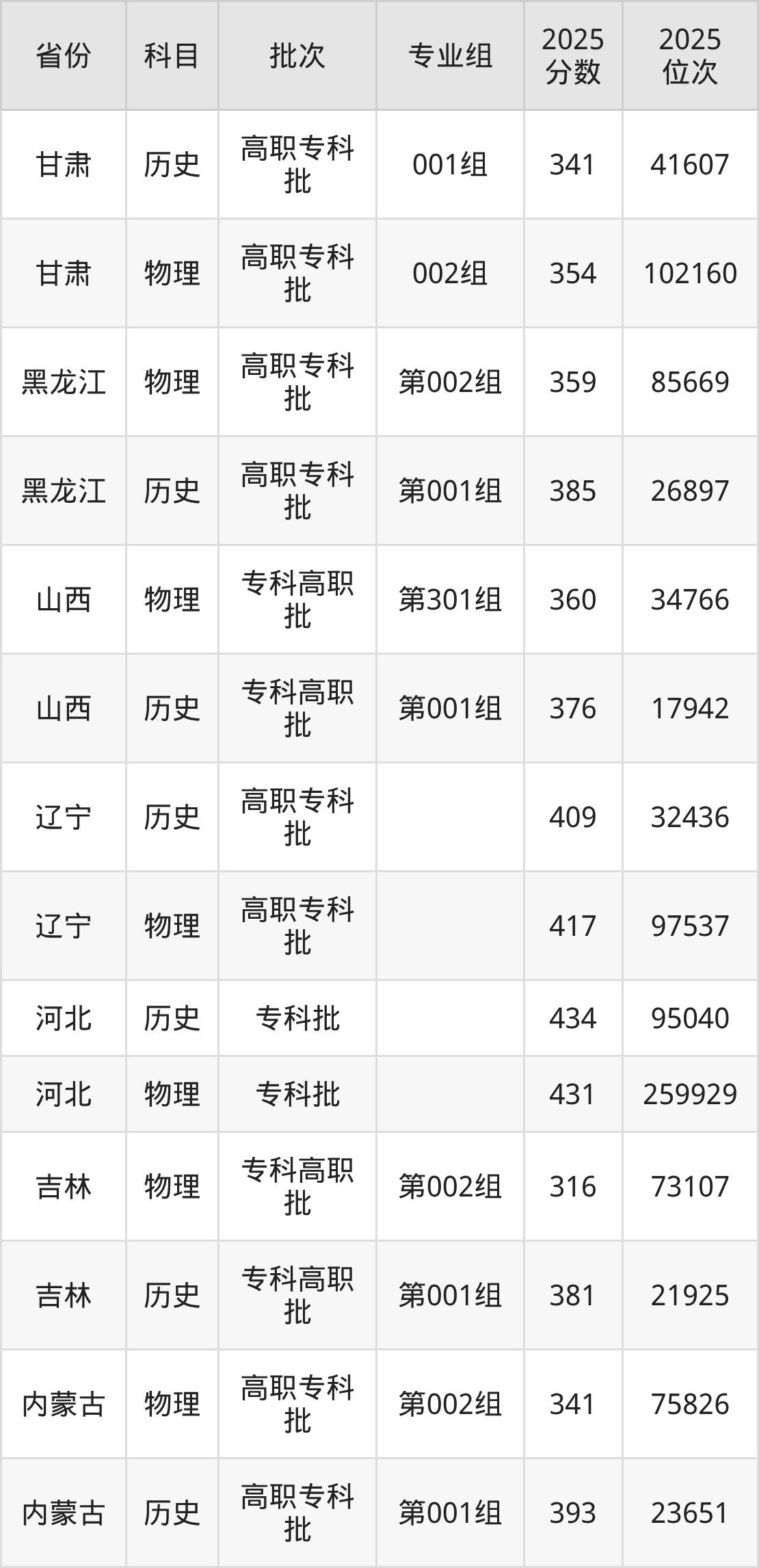 普通类专科物理类最低341分,专科历史类最低393分