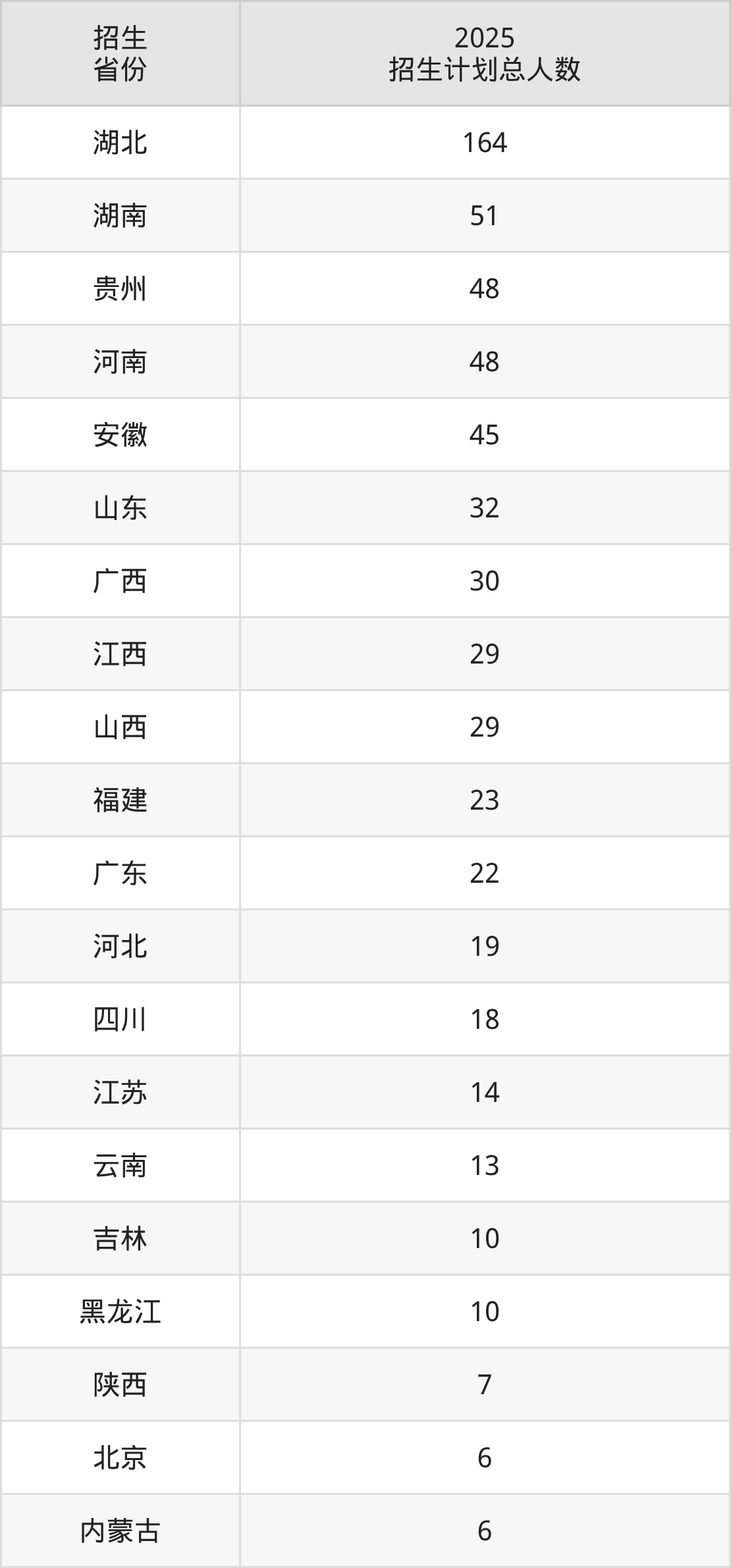2025年武汉体育学院面向全国24个省市开展本科招生;招生专业共14个,招生人数共642人。2025年在湖北省招生计划总人数是164人,其中,武汉体育学院在湖北省招生人数最多的是数据科学与大数据技术。武汉体育学院在各省具体招生人数情况如下表。