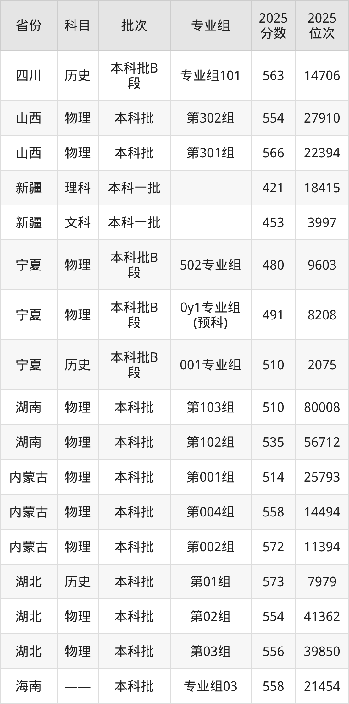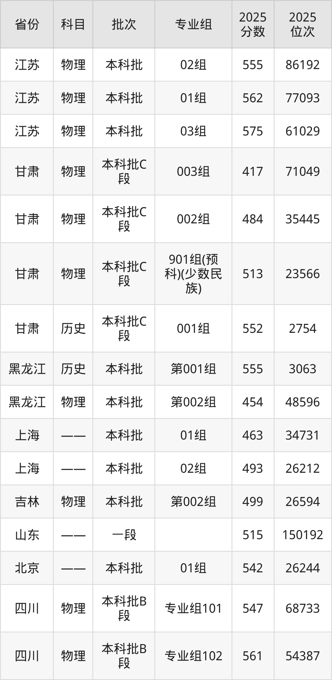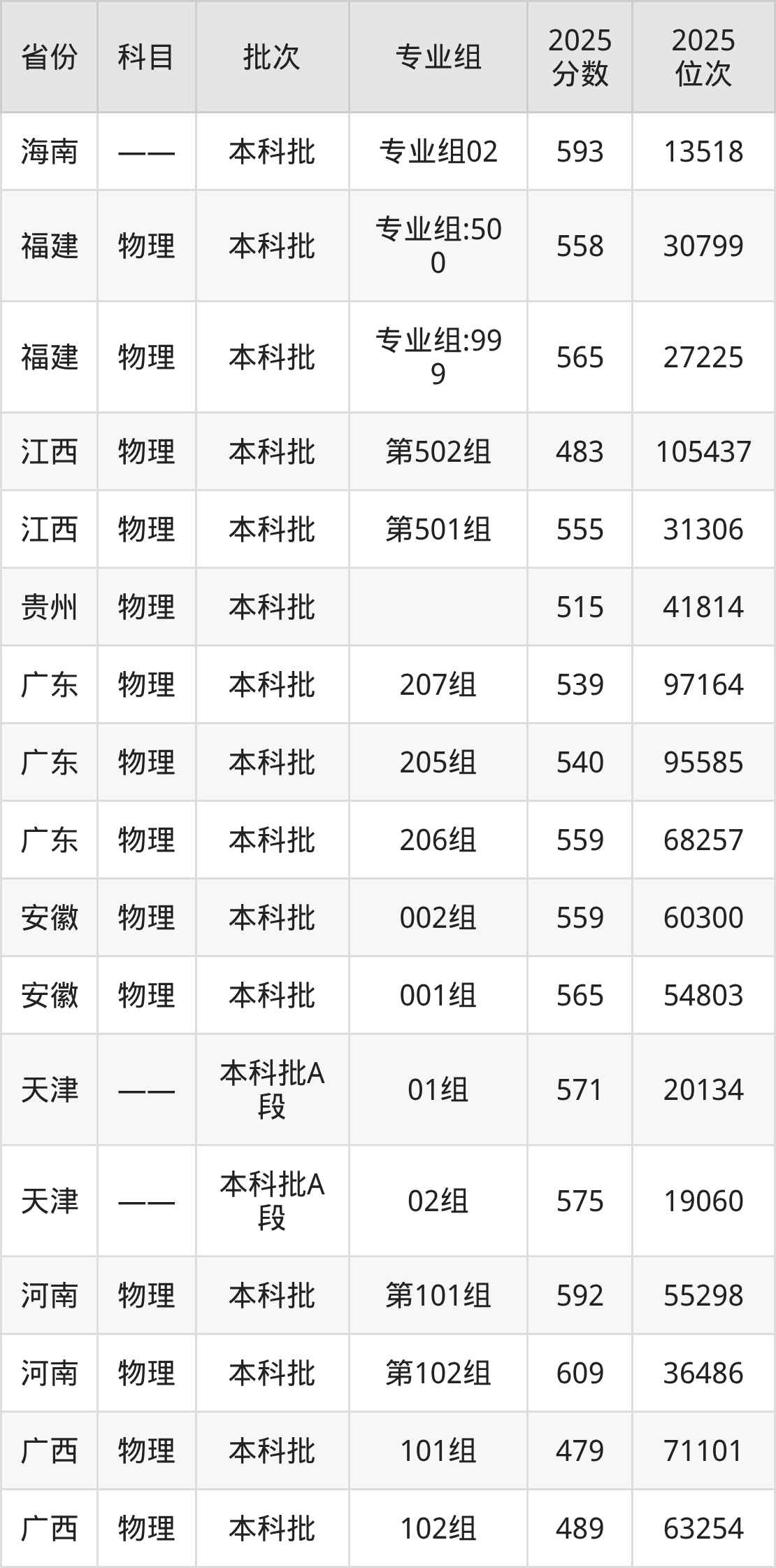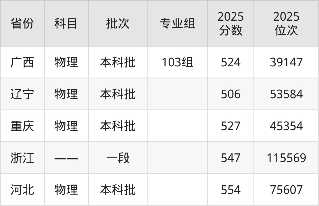 2025年在本科物理类进行招生,各专业组分数线详情如下: