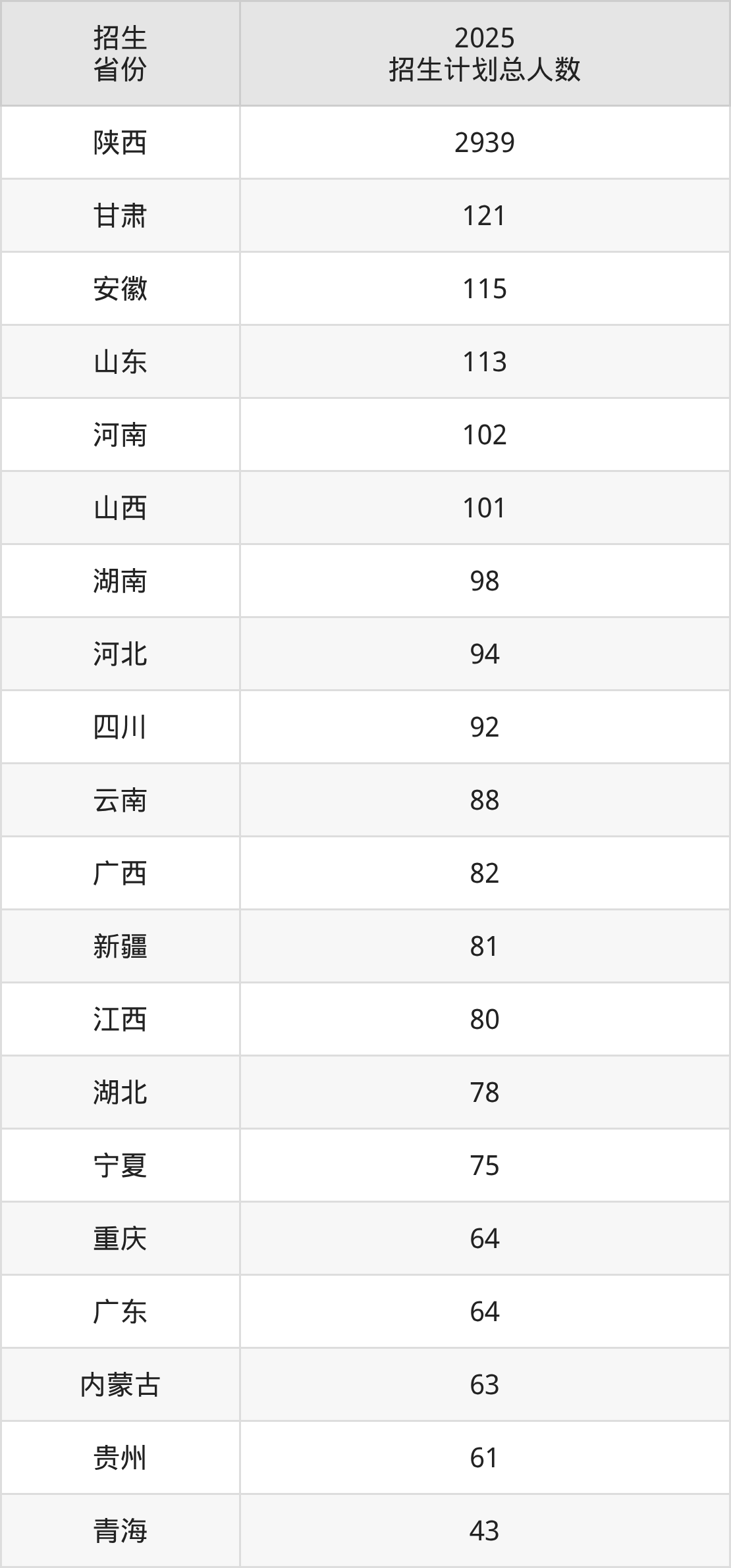 2025年西安科技大学面向全国29个省市开展本科招生;招生专业共56个,招生人数共4790人。2025年在陕西省招生计划总人数是2939人,其中,西安科技大学在陕西省招生人数最多的是机械设计制造及其自动化。西安科技大学在各省具体招生人数情况如下表。