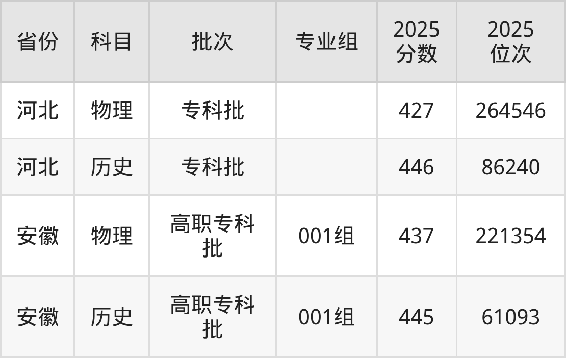 安徽商贸职业技术学院001组:2025年投档录取最低分为437分,录取最低位次为221354名。