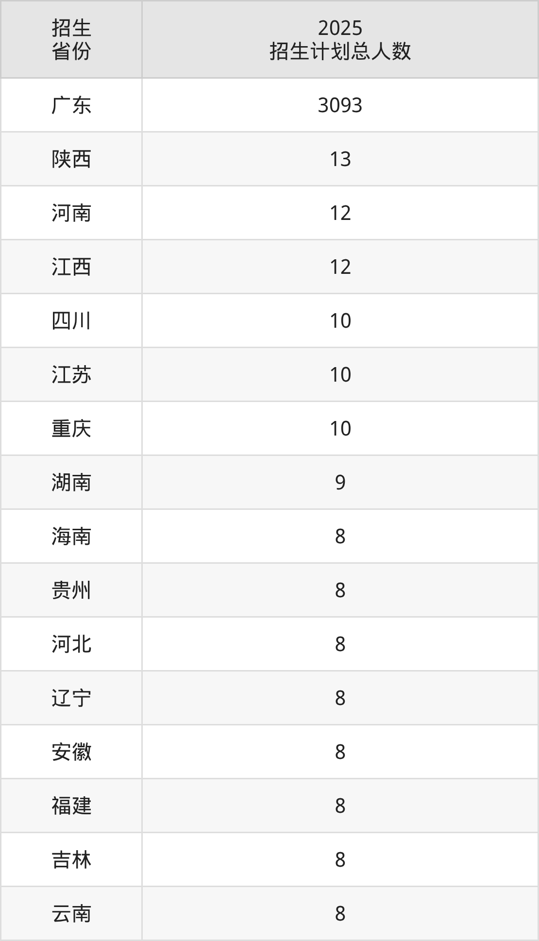 2025年广东外语外贸大学南国商学院面向全国19个省市开展本科招生;招生专业共34个,招生人数共3250人。2025年在广东省招生计划总人数是3093人,其中,广东外语外贸大学南国商学院在广东省招生人数最多的是汉语言文学。广东外语外贸大学南国商学院在各省具体招生人数情况如下表。