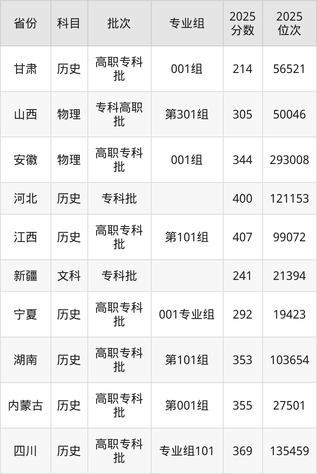 2025年在专科历史类进行招生,各专业组分数线详情如下: