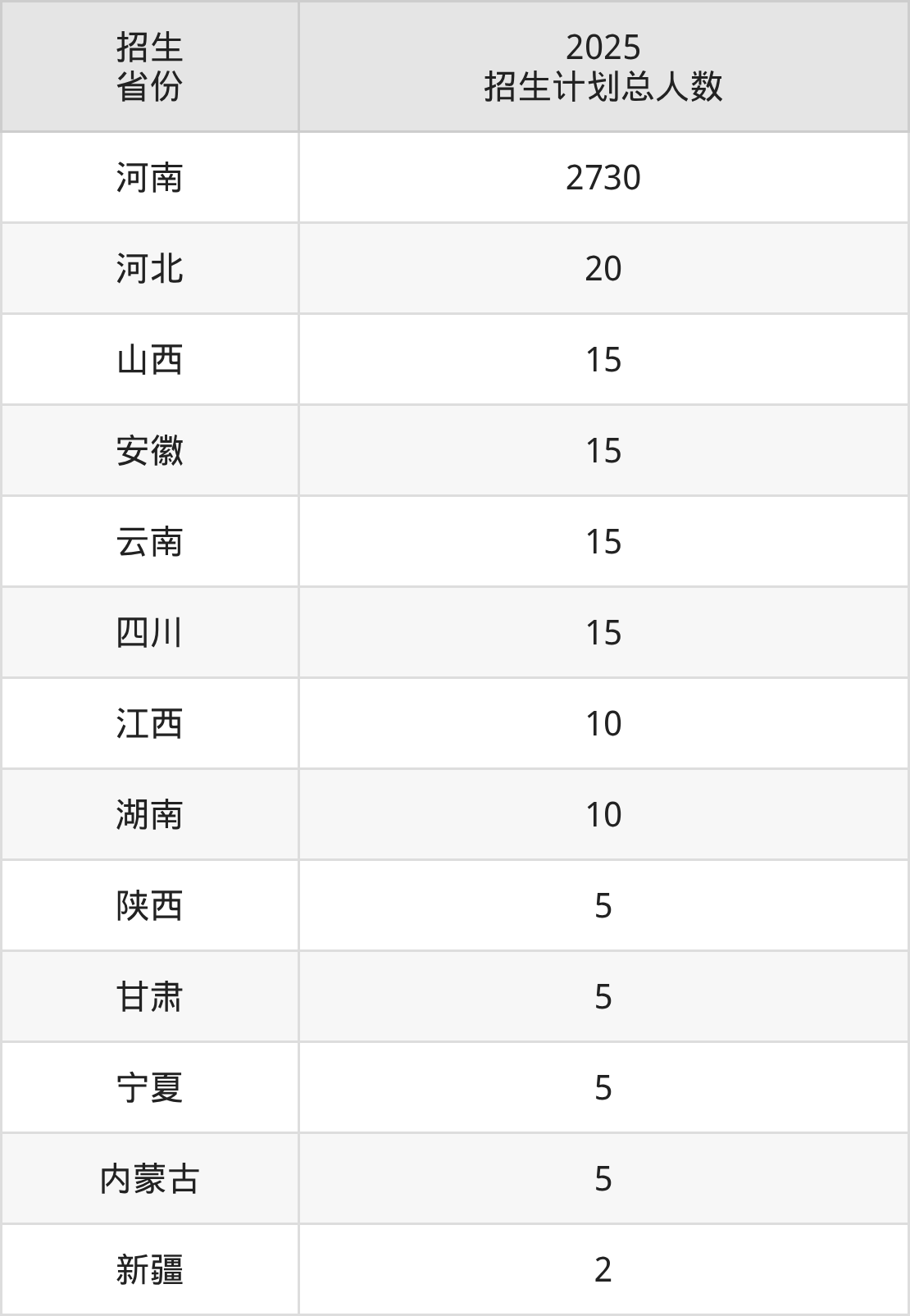 2025年郑州旅游职业学院面向全国13个省市开展专科招生;招生专业共35个,招生人数共2852人。2025年在河南省招生计划总人数是2730人,其中,郑州旅游职业学院在河南省招生人数最多的是酒店管理与数字化运营。郑州旅游职业学院在各省具体招生人数情况如下表。