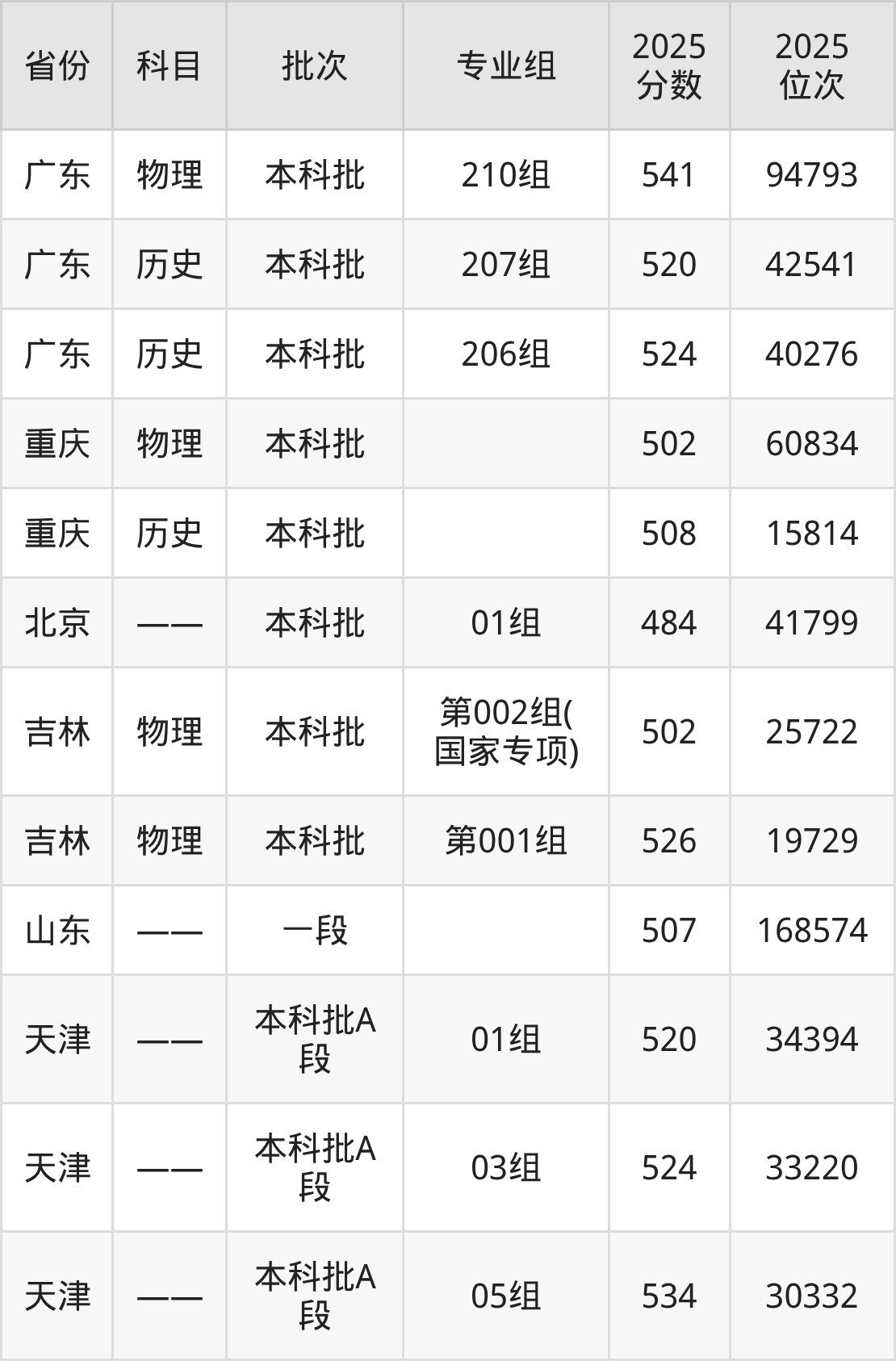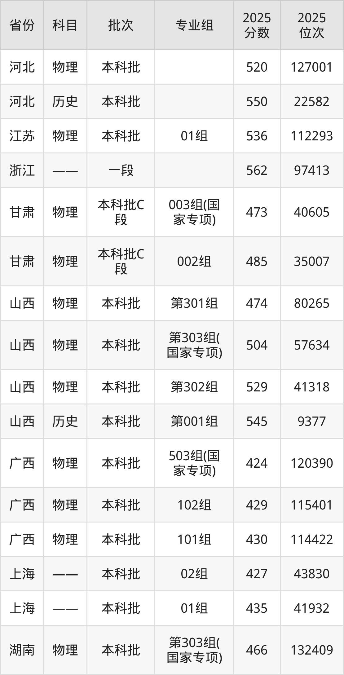 2025年投档录取最低分为520分,录取最低位次为127001名。