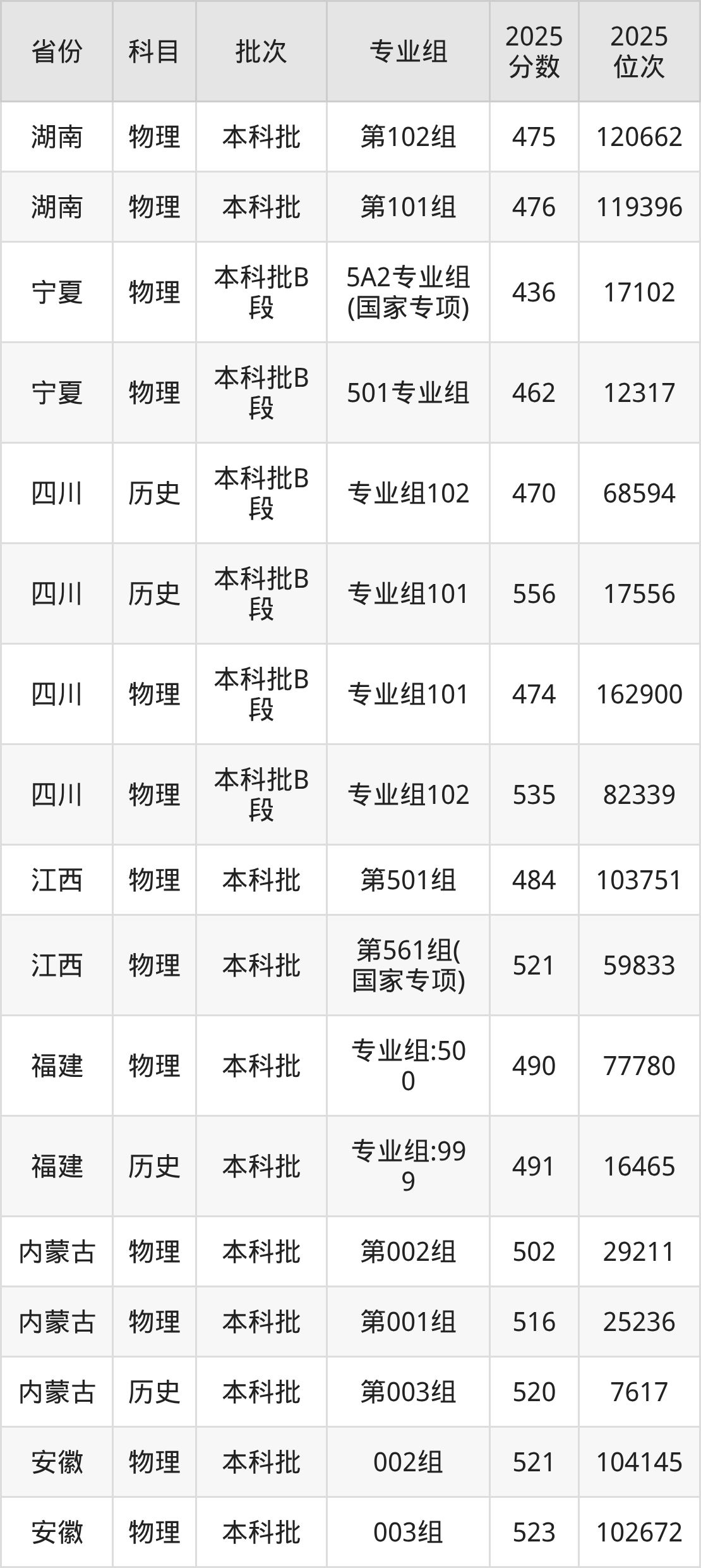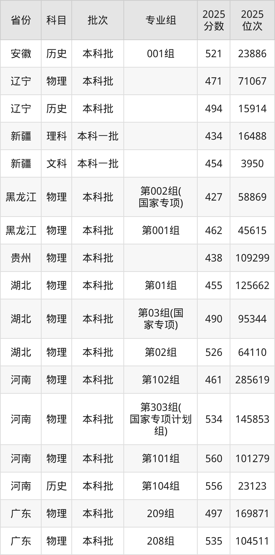 2025年在本科物理类进行招生,各专业组分数线详情如下: