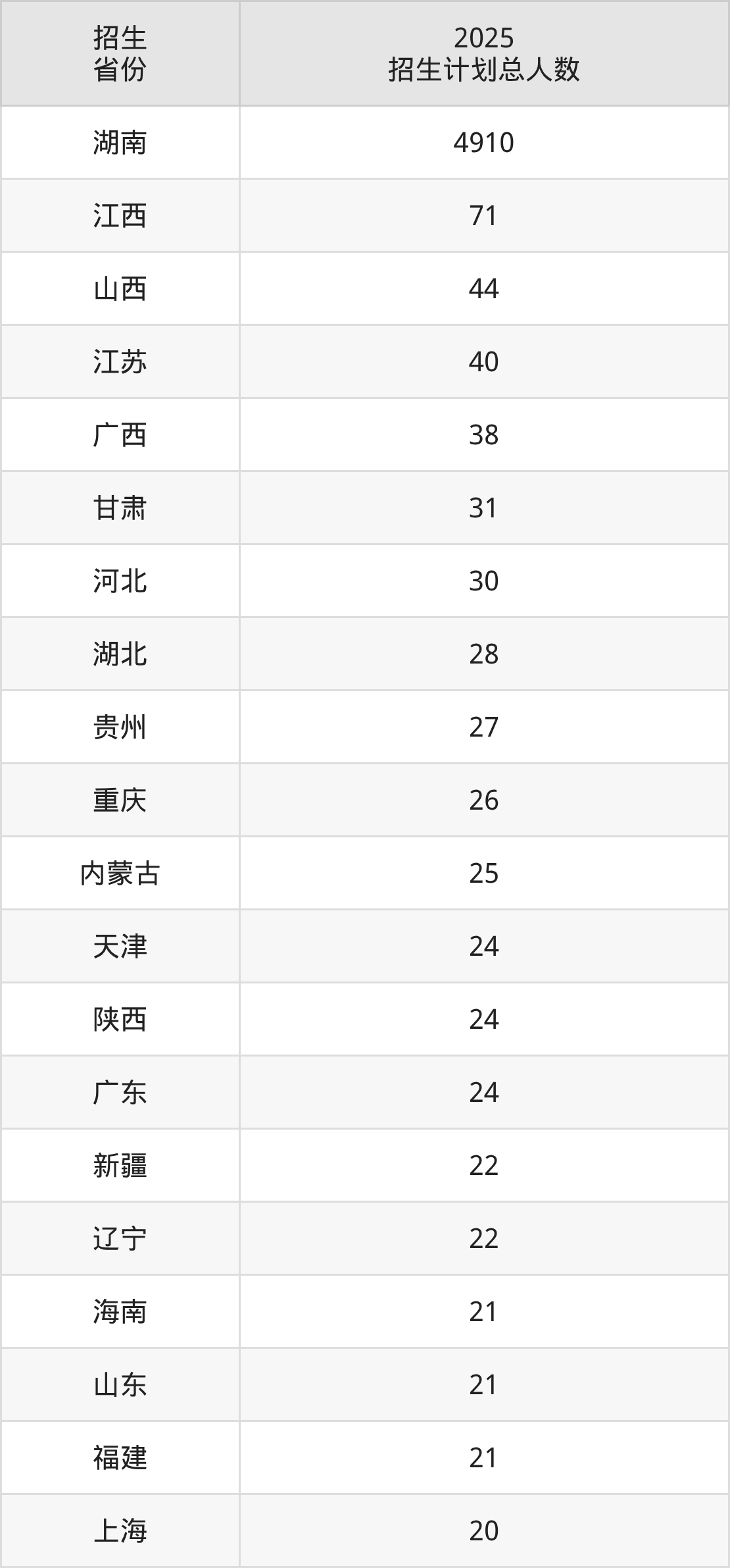 2025年湖南文理学院面向全国29个省市开展本科招生;招生专业共42个,招生人数共5579人。2025年在湖南省招生计划总人数是4910人,其中,湖南文理学院在湖南省招生人数最多的是机械设计制造及其自动化。湖南文理学院在各省具体招生人数情况如下表。