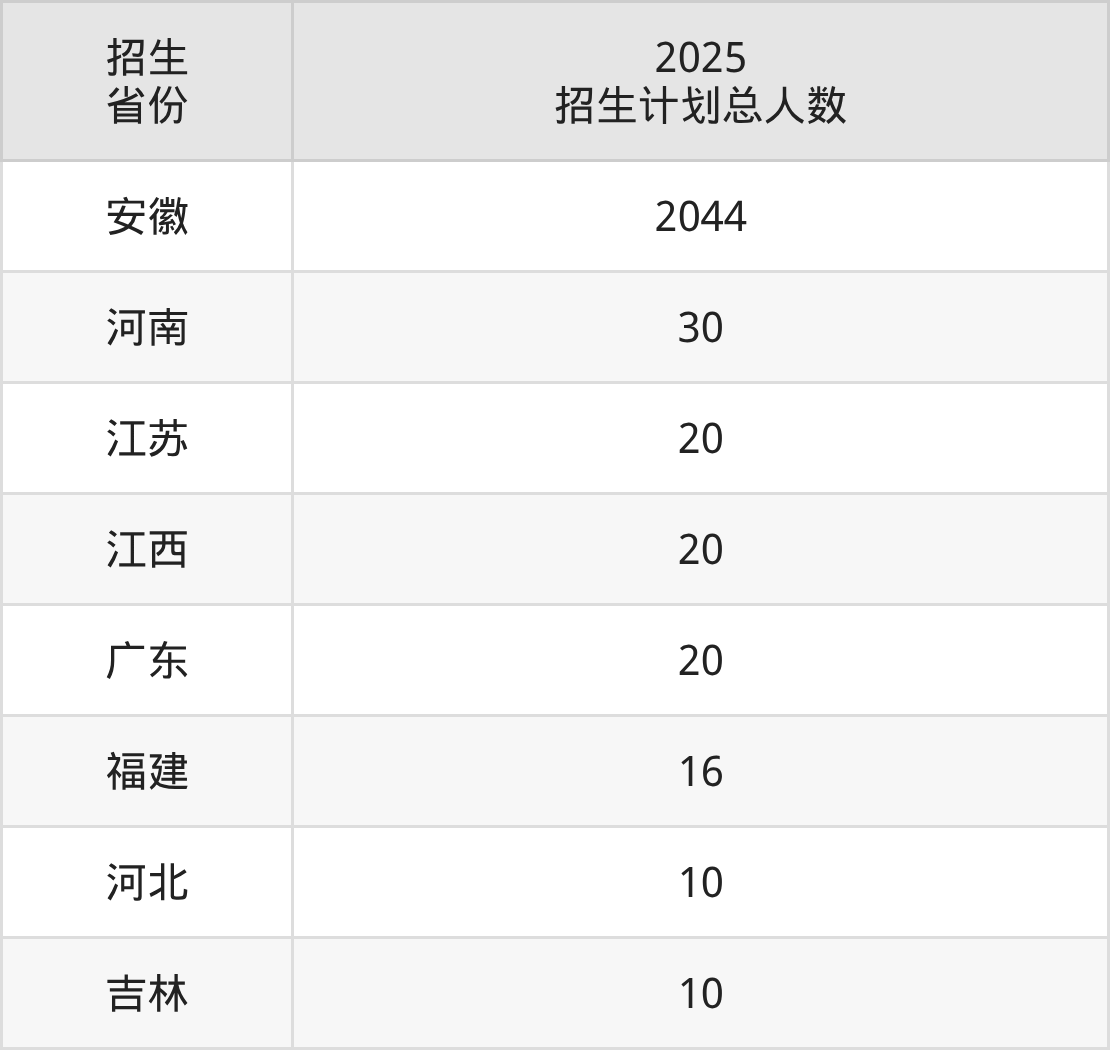 2025年安徽外国语学院面向全国8个省市开展本科招生;招生专业共32个,招生人数共2170人。2025年在安徽省招生计划总人数是2044人,其中,安徽外国语学院在安徽省招生人数最多的是计算机科学与技术。安徽外国语学院在各省具体招生人数情况如下表。