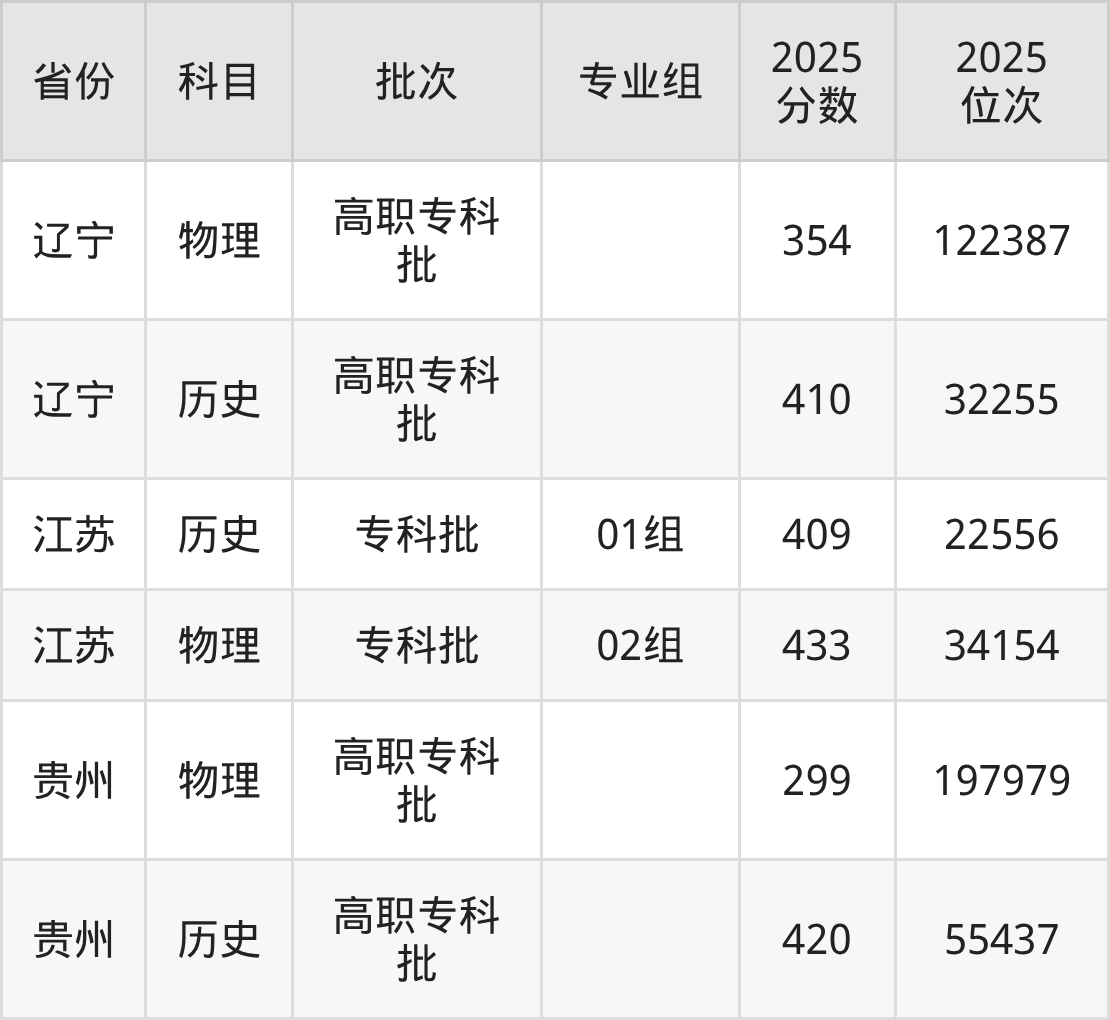 2025年合肥通用职业技术学院全国录取分数线是299分到433分,录取最低在贵州物理类、录取最高在江苏物理类(02组)。各省各专业组最低分具有差异,详情如下: