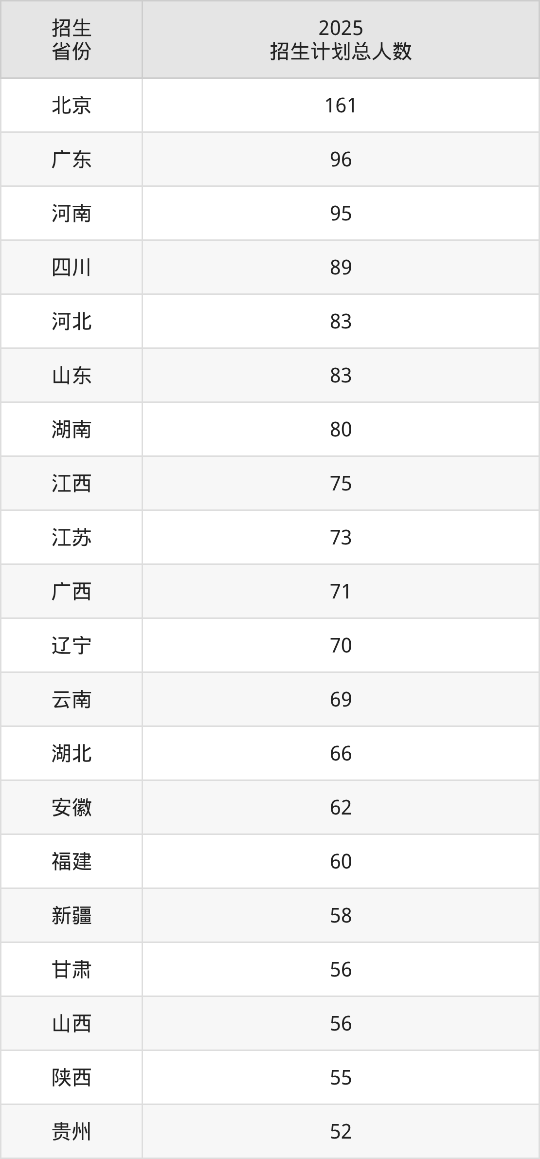 2025年对外经济贸易大学面向全国29个省市开展本科招生;招生专业共35个,招生人数共1852人。2025年在北京市招生计划总人数是161人,其中,对外经济贸易大学在北京市招生人数最多的是法学类。对外经济贸易大学在各省具体招生人数情况如下表。