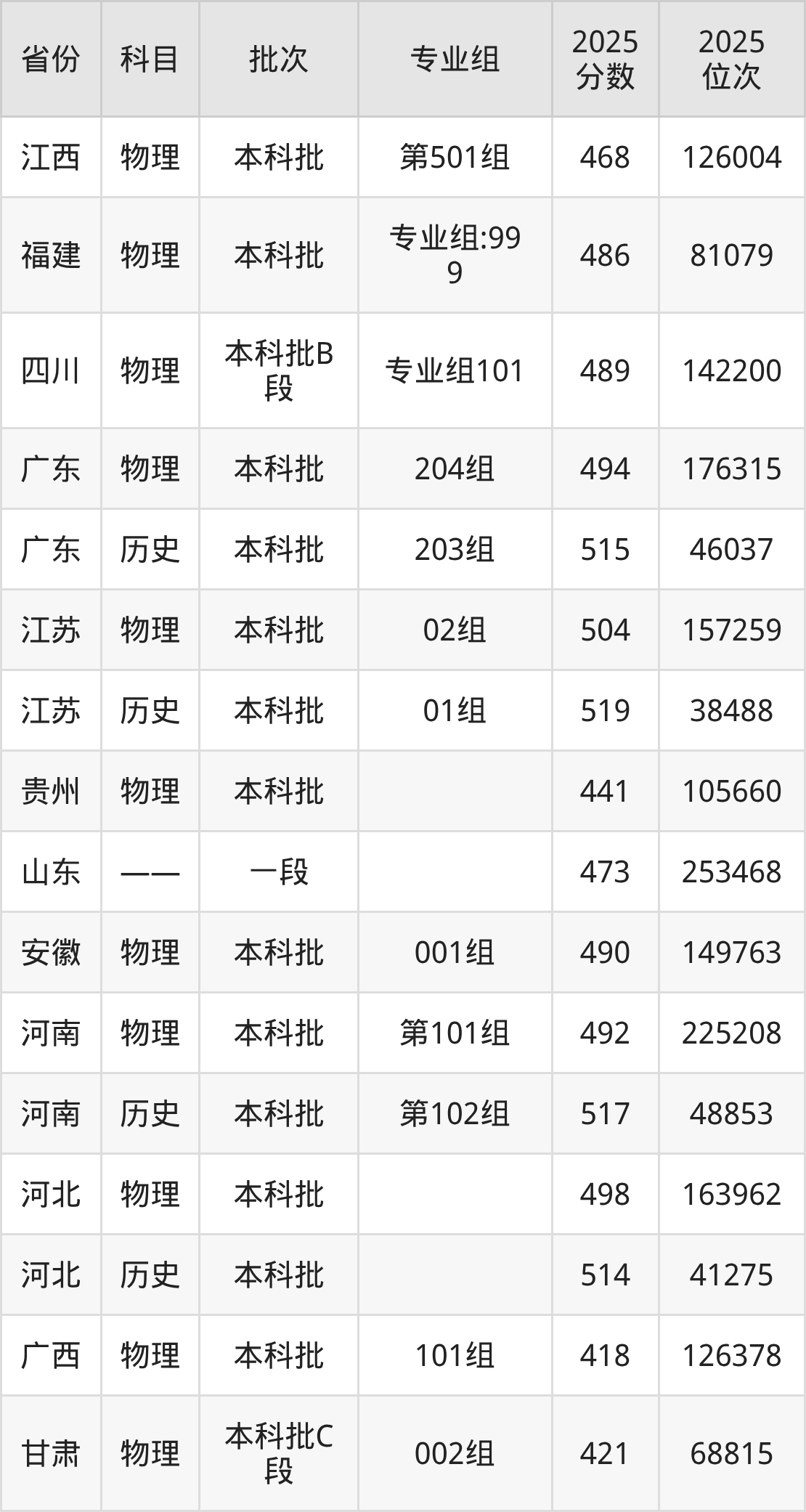 2025年在本科物理类进行招生,各专业组分数线详情如下: