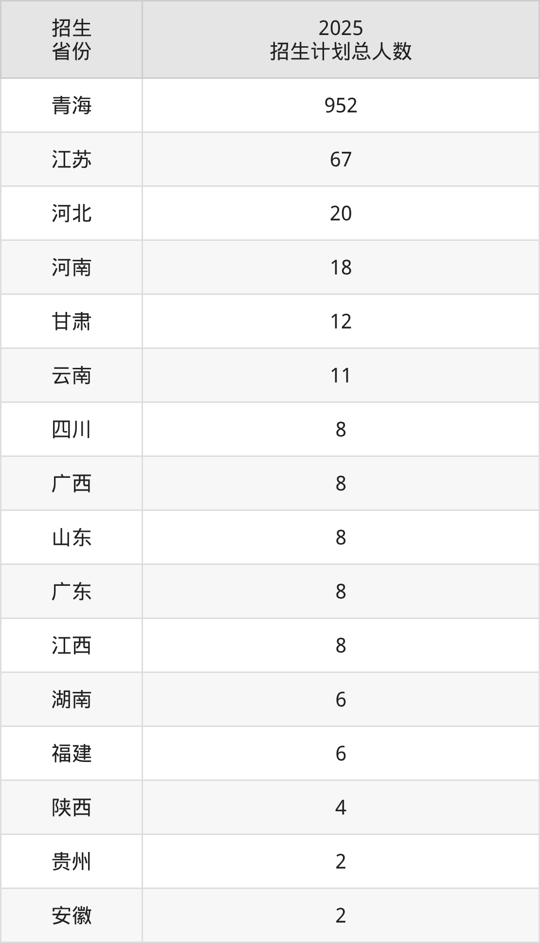 2025年青海职业技术大学面向全国16个省市开展本科招生;招生专业共11个,招生人数共1140人。2025年在青海省招生计划总人数是952人,其中,青海职业技术大学在青海省招生人数最多的是工程造价。青海职业技术大学在各省具体招生人数情况如下表。