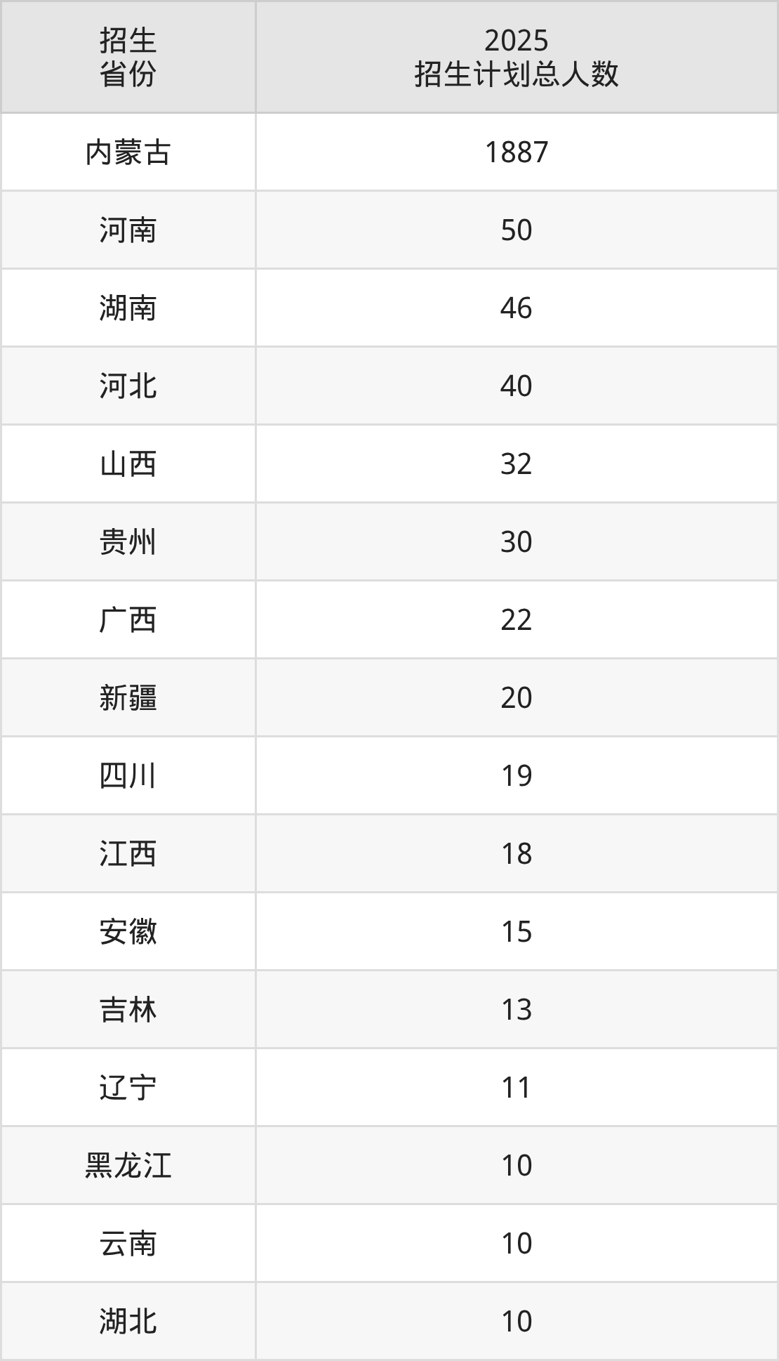 2025年内蒙古科技大学包头师范学院面向全国18个省市开展本科招生;招生专业共32个,招生人数共2250人。2025年在内蒙古自治区招生计划总人数是1887人,其中,内蒙古科技大学包头师范学院在内蒙古自治区招生人数最多的是生物科学。内蒙古科技大学包头师范学院在各省具体招生人数情况如下表。