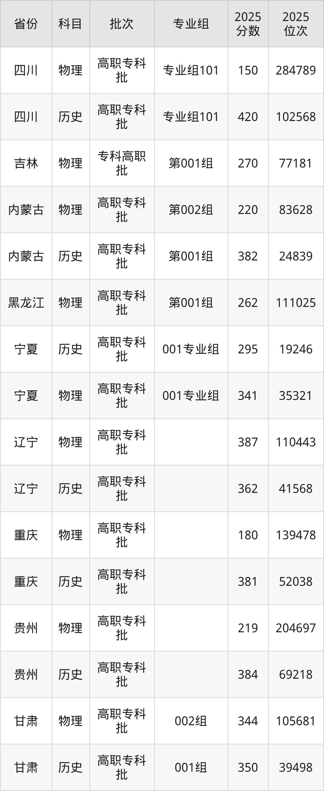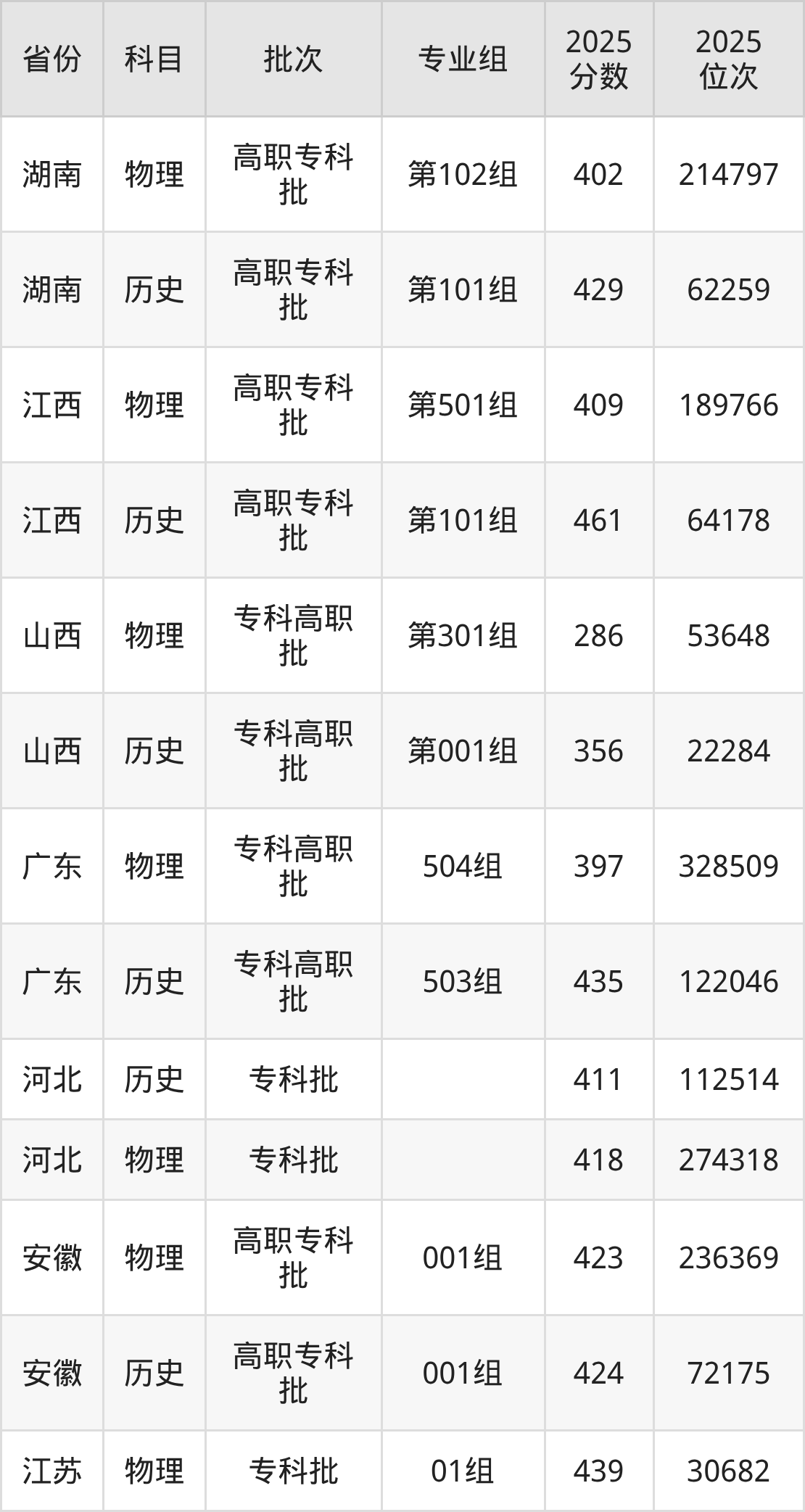 2025年在专科物理类进行招生,各专业组分数线详情如下: