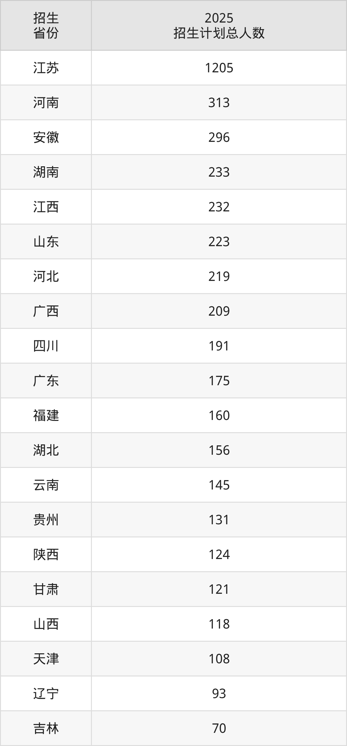 2025年河海大学面向全国29个省市开展本科招生;招生专业共62个,招生人数共4996人。2025年在江苏省招生计划总人数是1205人,其中,河海大学在江苏省招生人数最多的是物联网工程。河海大学在各省具体招生人数情况如下表。