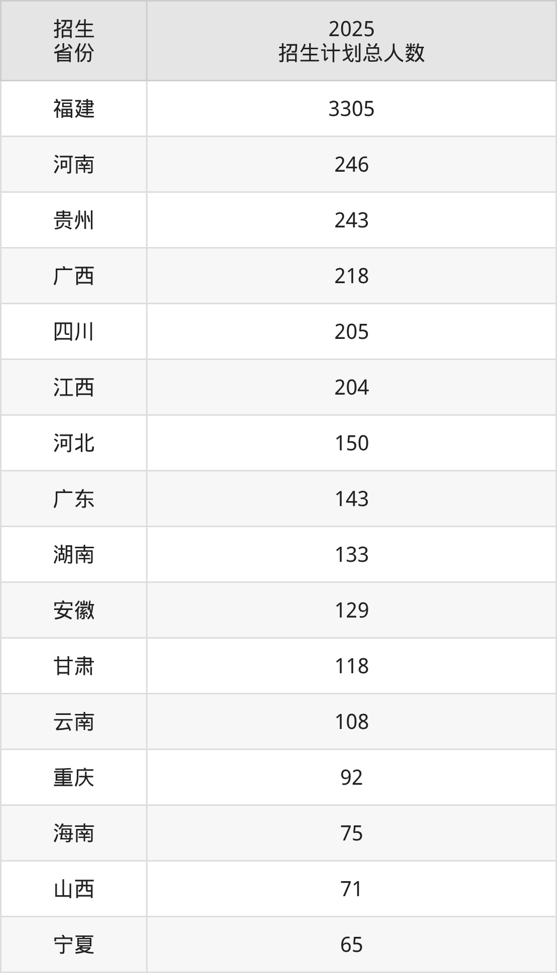 2025年福建农林大学面向全国28个省市开展本科招生;招生专业共75个,招生人数共5768人。2025年在福建省招生计划总人数是3305人,其中,福建农林大学在福建省招生人数最多的是机械设计制造及其自动化。福建农林大学在各省具体招生人数情况如下表。