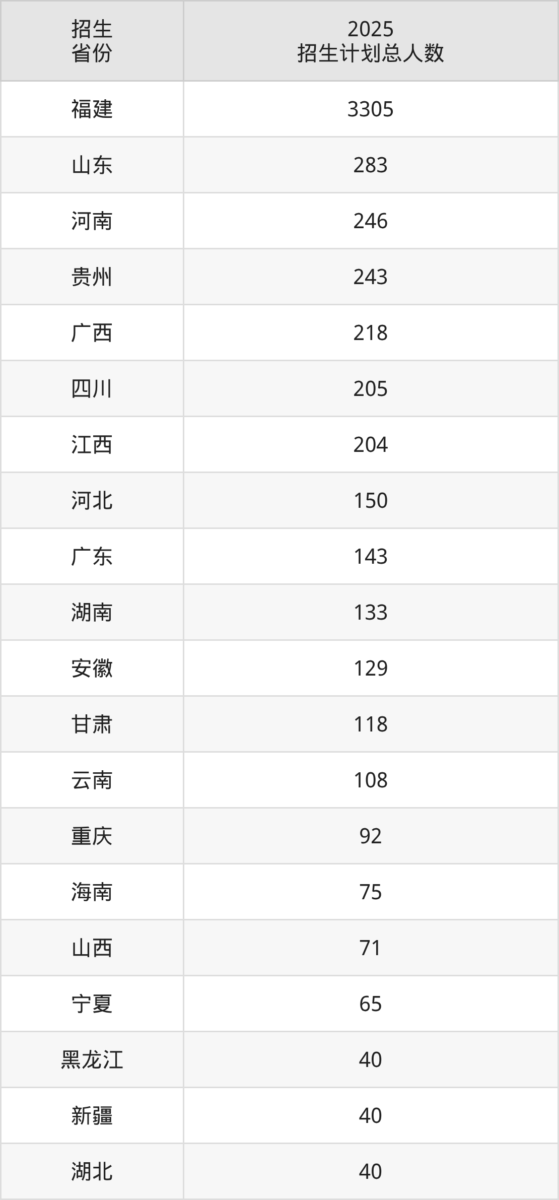 2025年福建农林大学面向全国29个省市开展本科招生;招生专业共75个,招生人数共6051人。2025年在福建省招生计划总人数是3305人,其中,福建农林大学在福建省招生人数最多的是机械设计制造及其自动化。福建农林大学在各省具体招生人数情况如下表。