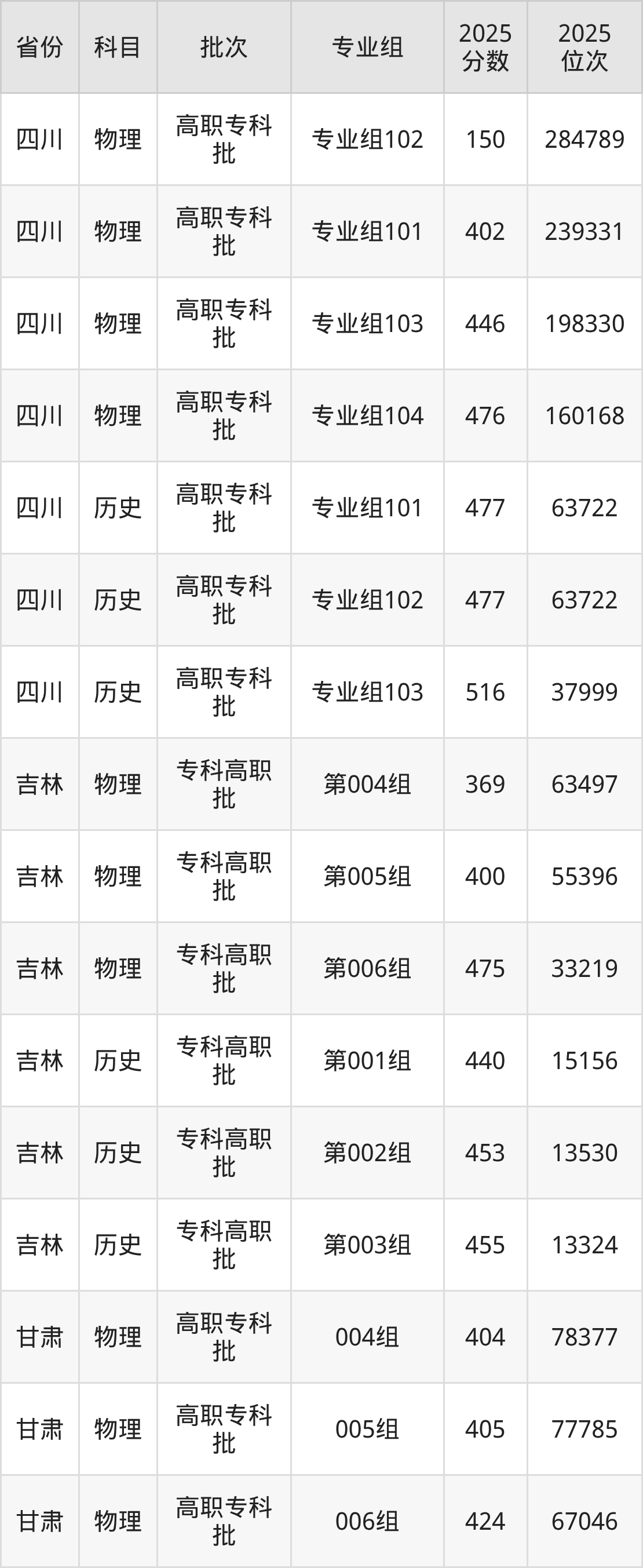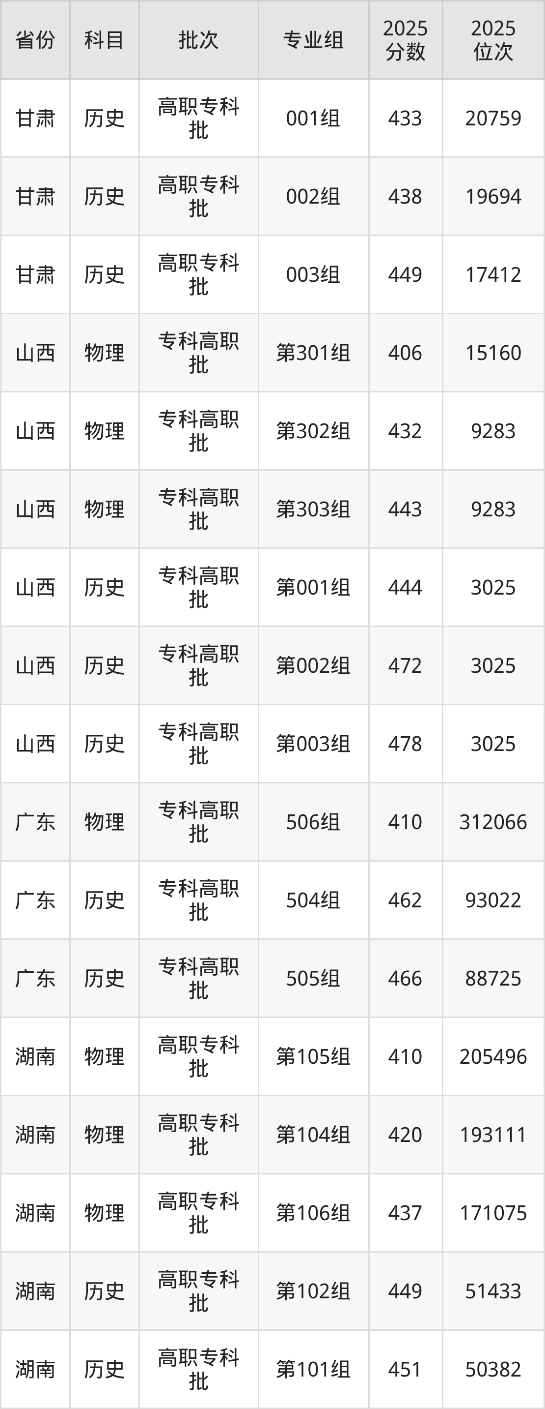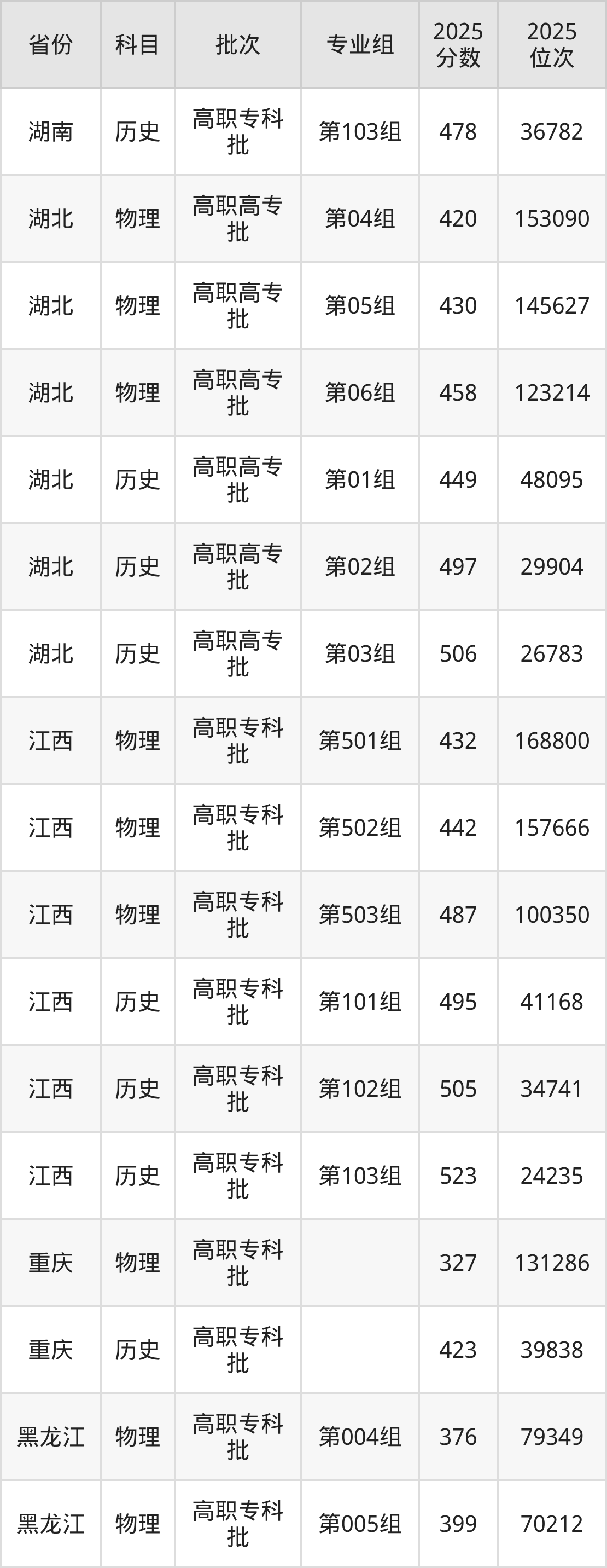 2025年长沙卫生职业学院全国录取分数线是150分到523分,录取最低在四川物理类(专业组102)、录取最高在江西历史类(第103组)。各省各专业组最低分具有差异,详情如下: