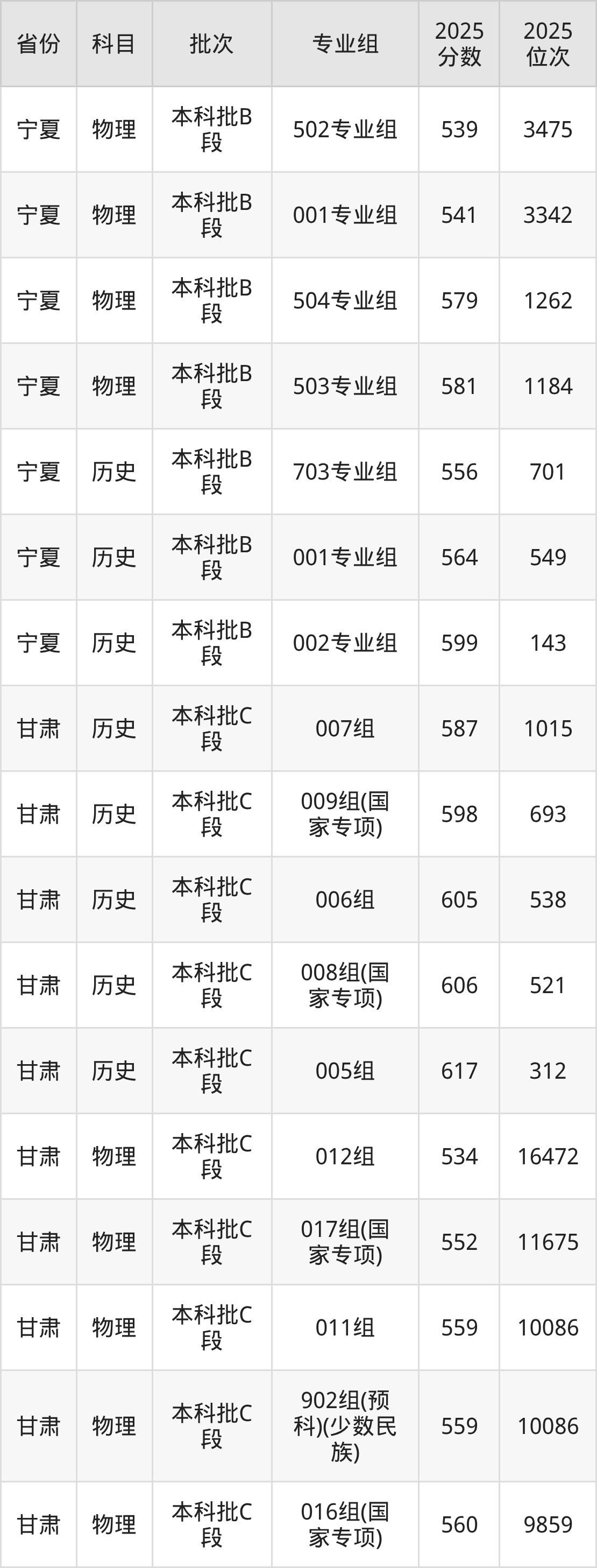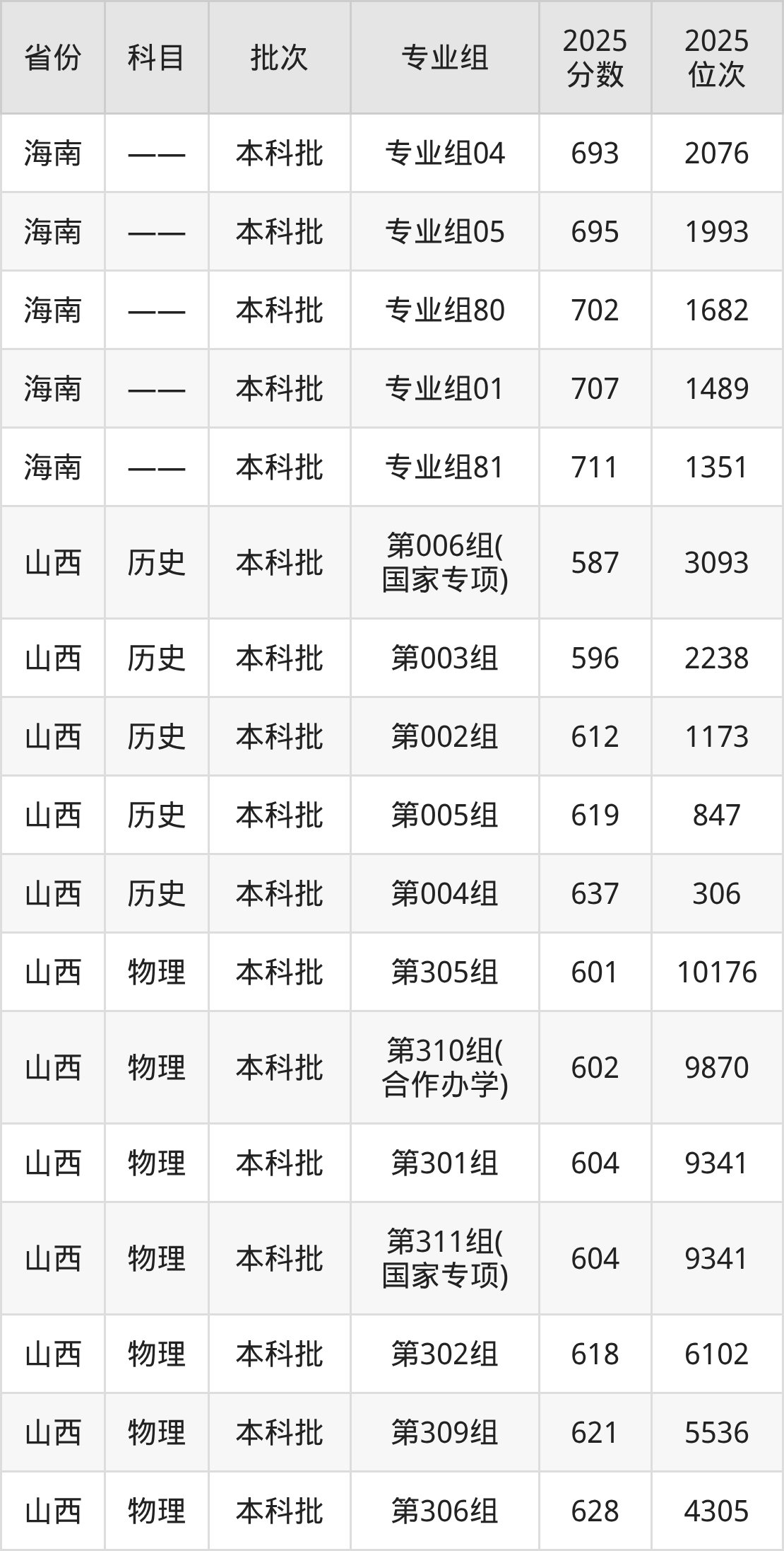 吉林大学第006组(国家专项计划):2025年投档录取最低分为587分,录取最低位次为3093名。