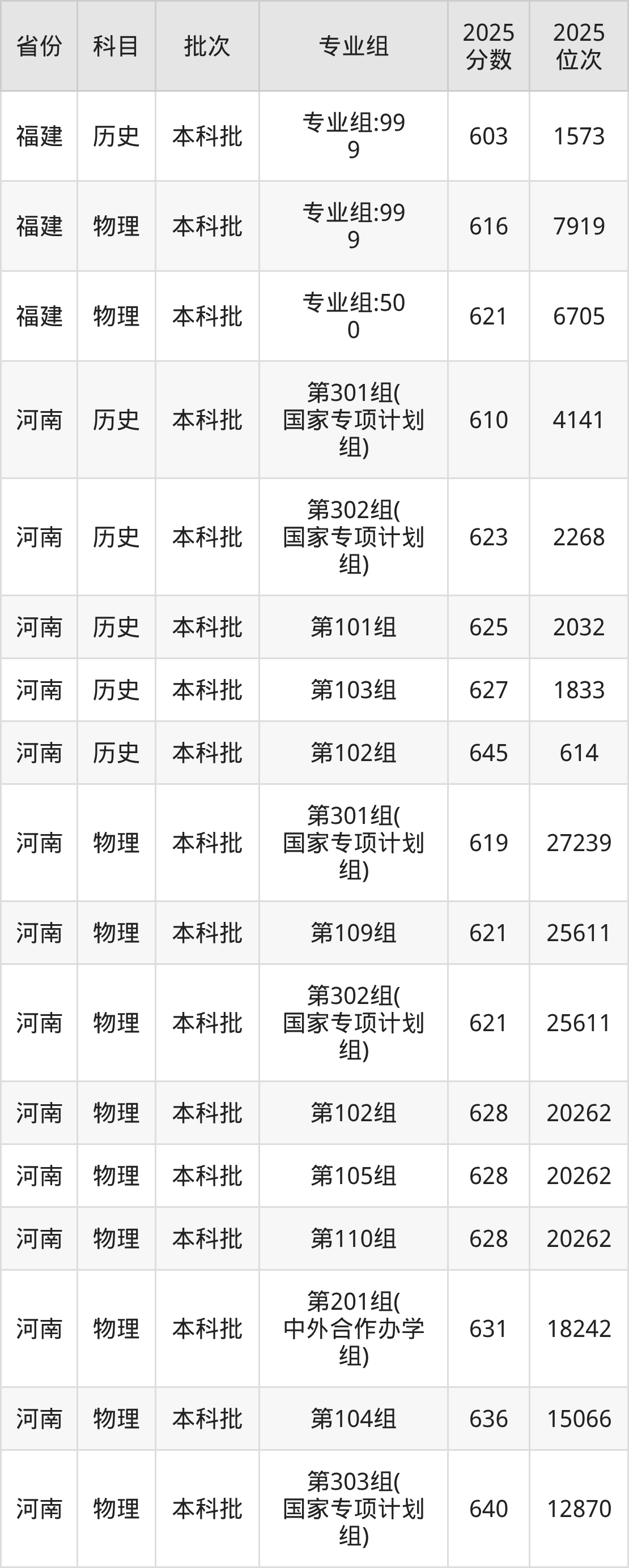 吉林大学009专业组(国家专项计划):2025年投档录取最低分为598分,录取最低位次为693名。