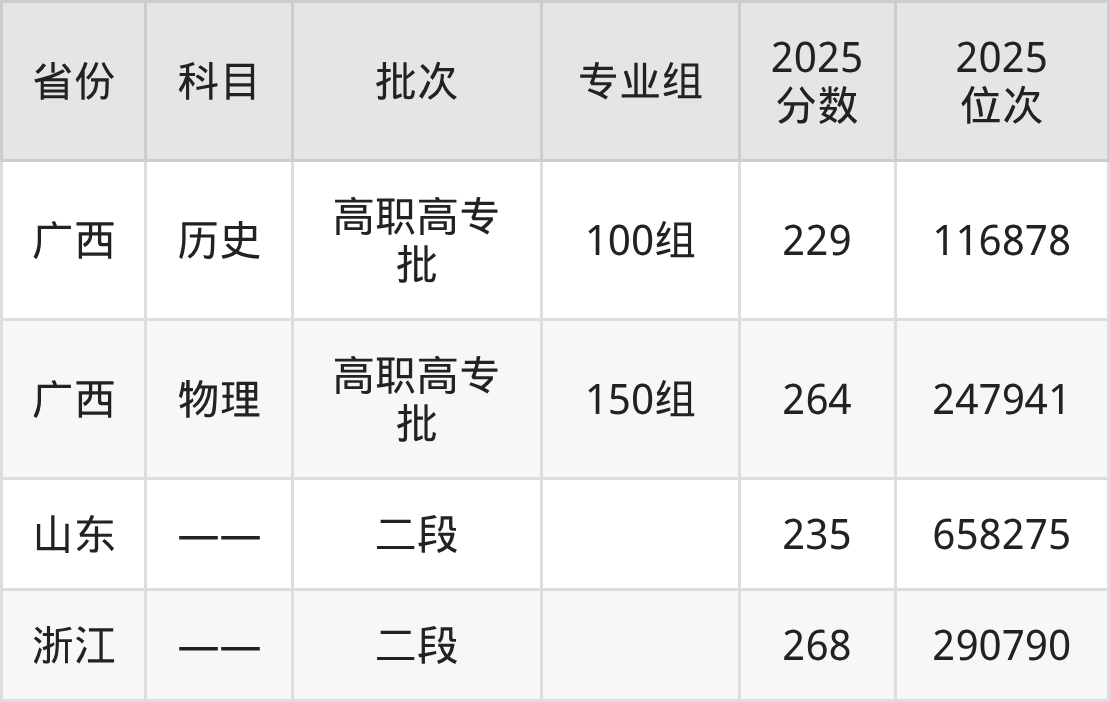 下面是2025年广西培贤国际职业学院全国录取分数线一览表,请查阅。