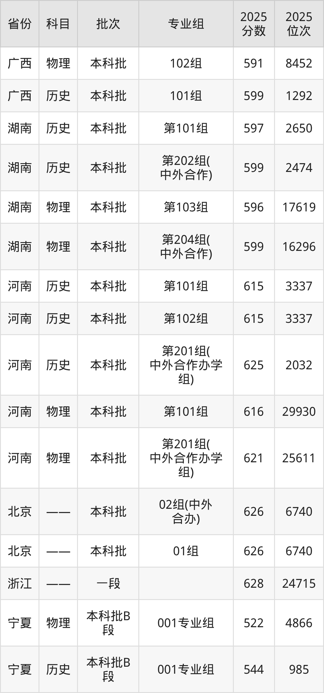 西南政法大学07组(中外合作办学):2025年投档录取最低分为626分,录取最低位次为15099名。