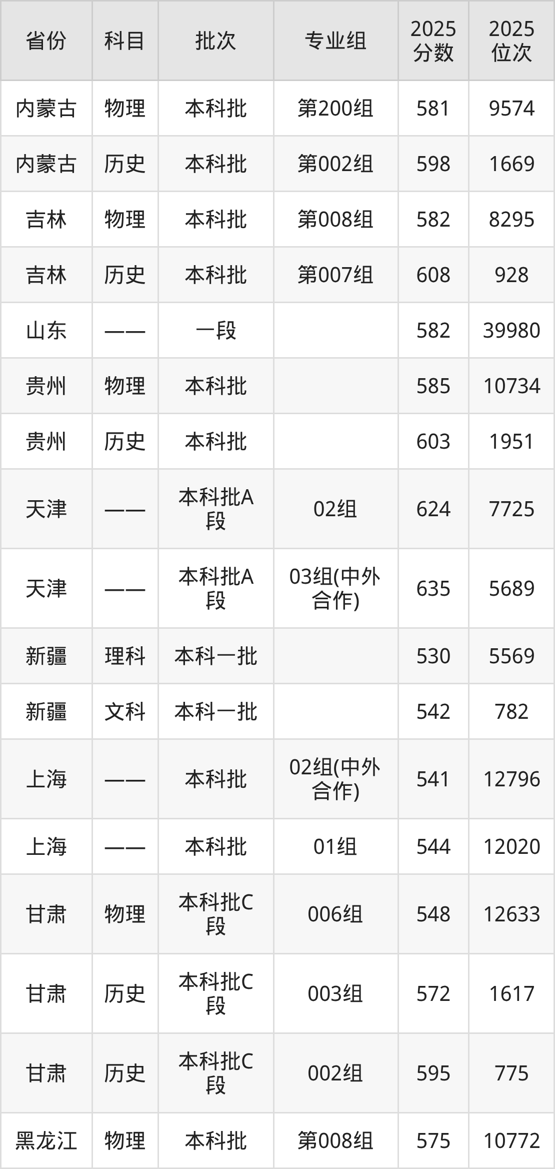 2025年投档录取最低分为580分,录取最低位次为20541名。