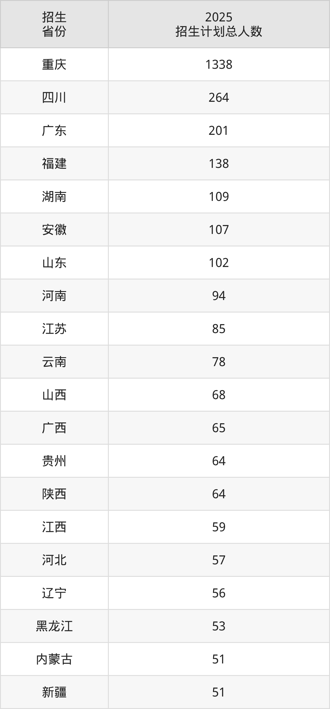 2025年西南政法大学面向全国29个省市开展本科招生;招生专业共20个,招生人数共3390人。2025年在重庆市招生计划总人数是1338人,其中,西南政法大学在重庆市招生人数最多的是法学。西南政法大学在各省具体招生人数情况如下表。