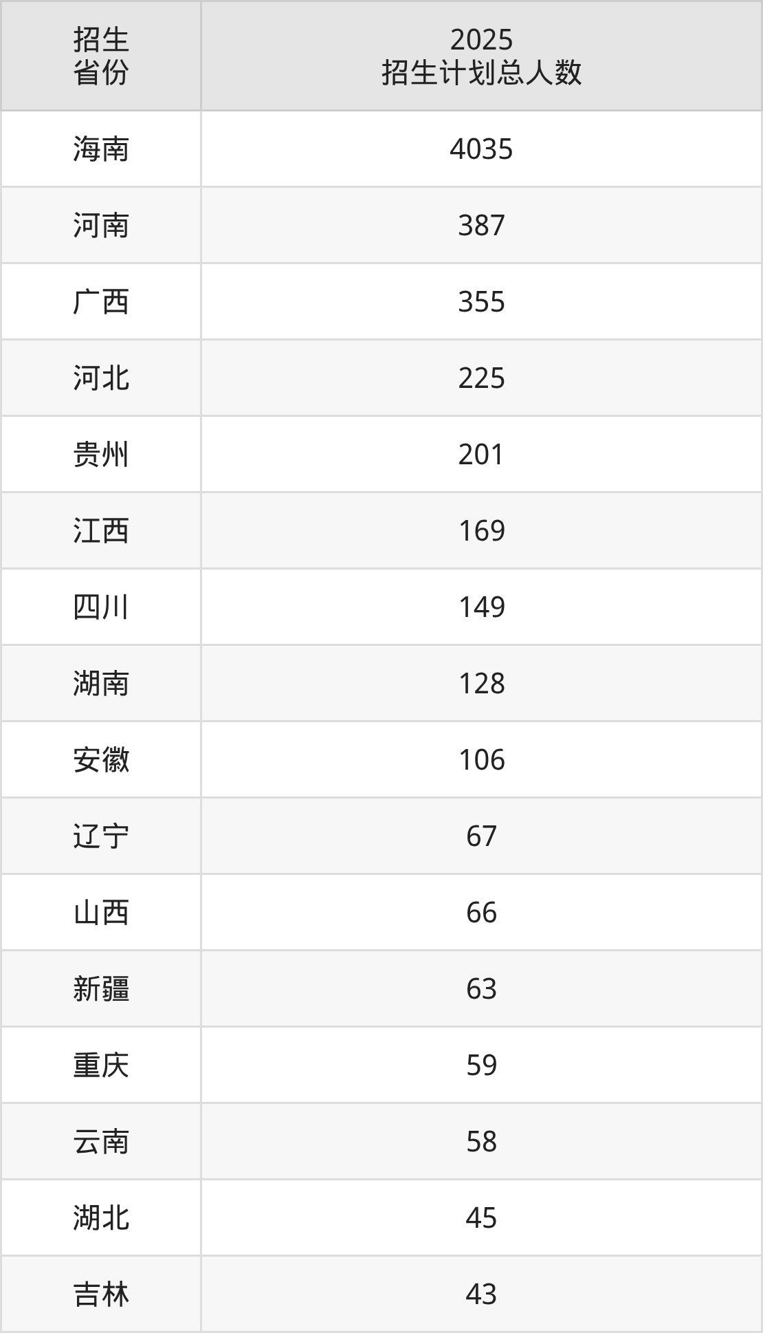 2025年海南科技职业大学面向全国25个省市开展本科招生;招生专业共25个,招生人数共3124人。2025年在海南省招生计划总人数是4035人,其中,海南科技职业大学在海南省招生人数最多的是护理。海南科技职业大学在各省具体招生人数情况如下表。